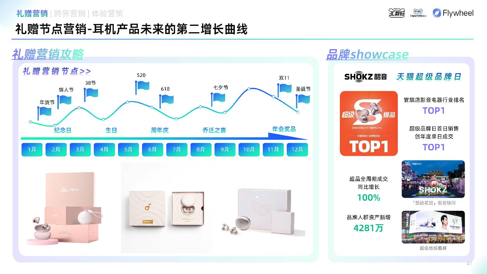 以Shokz韶音在天猫超品日的营销为例,通过参与天猫超级品牌日,韶音实现了显著的品效协同。活动期间,品牌不仅斩获多项头部排名,更实现超品全周期成交额同比提升100%,并成功新增4281万品牌人群资产。这一案例印证了头部电商平台与礼赠场景的结合,能为耳机品牌带来爆发式增长与长效用户积累。