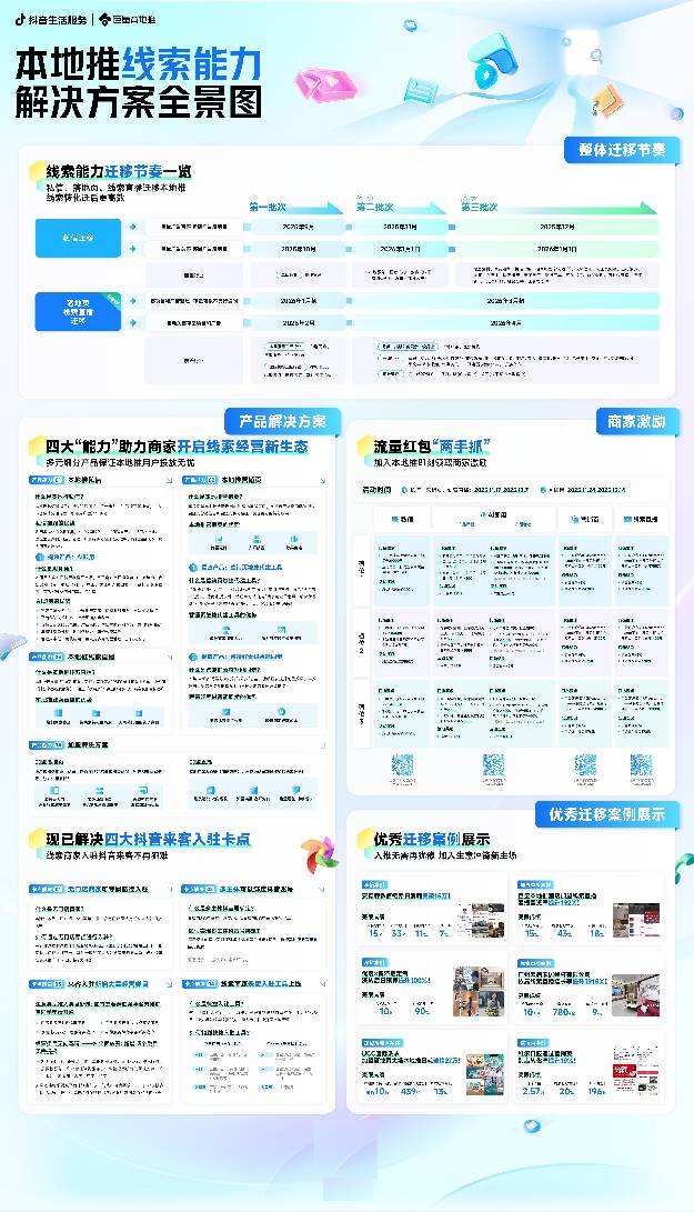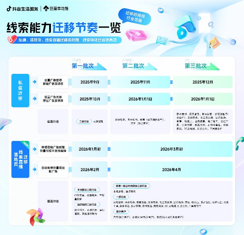 为更好地辅助商家捕捉精准流量,获得脚踏实地的生意结果,巨量本地推将整体在本地推上重点发力,成为线索生意新主场。为更好的完善巨量本地推的产品生态,全方位满足商家营销需求,以私信、营销页、线索直播为代表的各线索能力也将陆续迁移至巨量本地推,为保证存量项目正常运转,迁移动作将分多批次进行,以下为具体迁移节奏及覆盖行业范围。