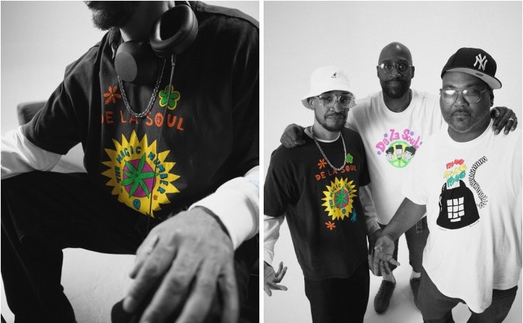Levi’s® x De La Soul联名系列囊括三款短袖与一款长袖 T 恤。其中白色短袖正面印有三位成员的肖像,背面印有 “This is My De La Soul T-Shirt” 字样。黑色短袖则致敬经典单曲 “The Magic Number” (出自《3 Feet High and Rising》),而另一款白色短袖则致敬热门单曲 “Ring Ring Ring (Ha Ha Hey)” (出自第二张专辑《De La Soul Is Dead》)。
