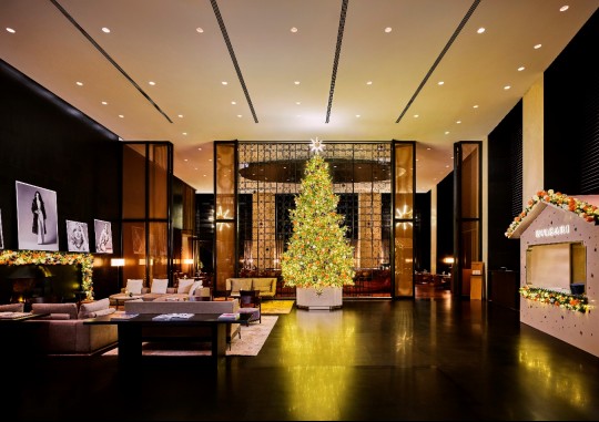 宝格丽雪橇以优雅线条与精巧细节,静驻于大堂,为华美空间增添一抹灵动意趣。一棵树龄逾三十年、高约五米的科罗拉多蓝杉巍然矗立,成为宽敞空间的视觉焦点。树上饰以缤纷节日彩球,顶部镶嵌经典八芒星,与精心布置的蓝色礼盒及节日小屋共同勾勒出静谧而欢愉的节日画卷,续写宝格丽的当代风华。