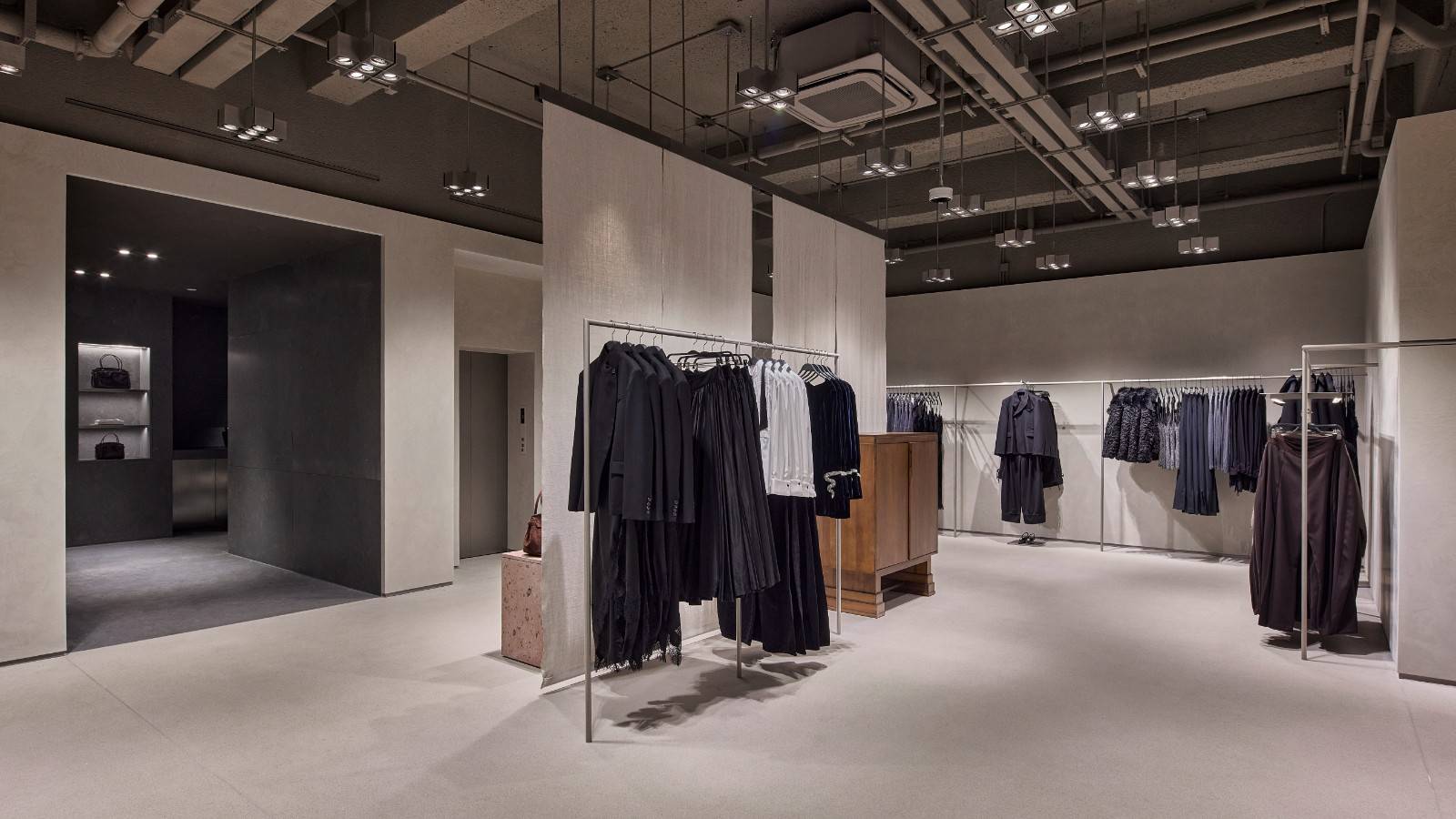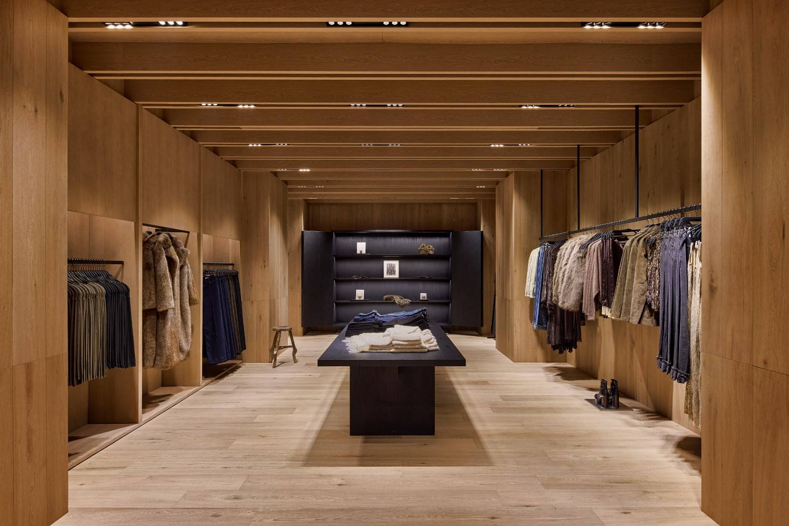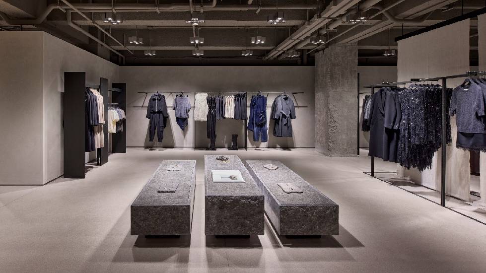 步入店内空间,感官细节处处可见:工业质感的墙面,融入木材、天然织物与多样的肌理元素、软木元素作为自然材质点缀其间,同时中性及大地色系构成主色调,配合层次丰富的灯光效果。与此形成对比的是年轻女装系列专属区域——不锈钢元素、流线型轮廓与特色家具共同勾勒出该系列的独特风格。男装系列则呈现出更为精致的场景,深色基调辅以不锈钢细节与木纹饰面,营造沉稳氛围。试衣间区域从二十世纪初的设计中汲取灵感,呼应黄浦区历史建筑特有的几何线条与大胆传承的美学风格。墙面精选的系列摄影作品进一步完整了空间视觉叙事,与服装系列相得益彰。