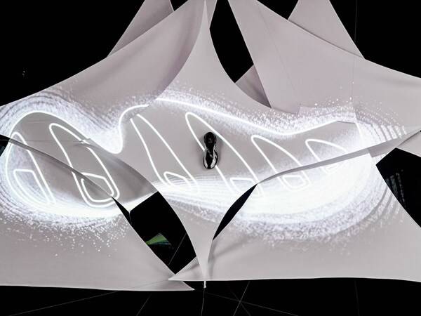 「智酷新生」作为核心展区,完整揭示了设计历程:从 Robbie Fuller 手稿、VETTA 黄金比例解析,到 V 形中心装置,直观呈现从概念到结构的思考路径。回弹缓震科技通过动态投影实现可视化演绎,让性能被看见与感知。AI 智绘互动结合脑波感应,将观者情绪实时转化为独一无二的数字艺术图像,实现风格共创。