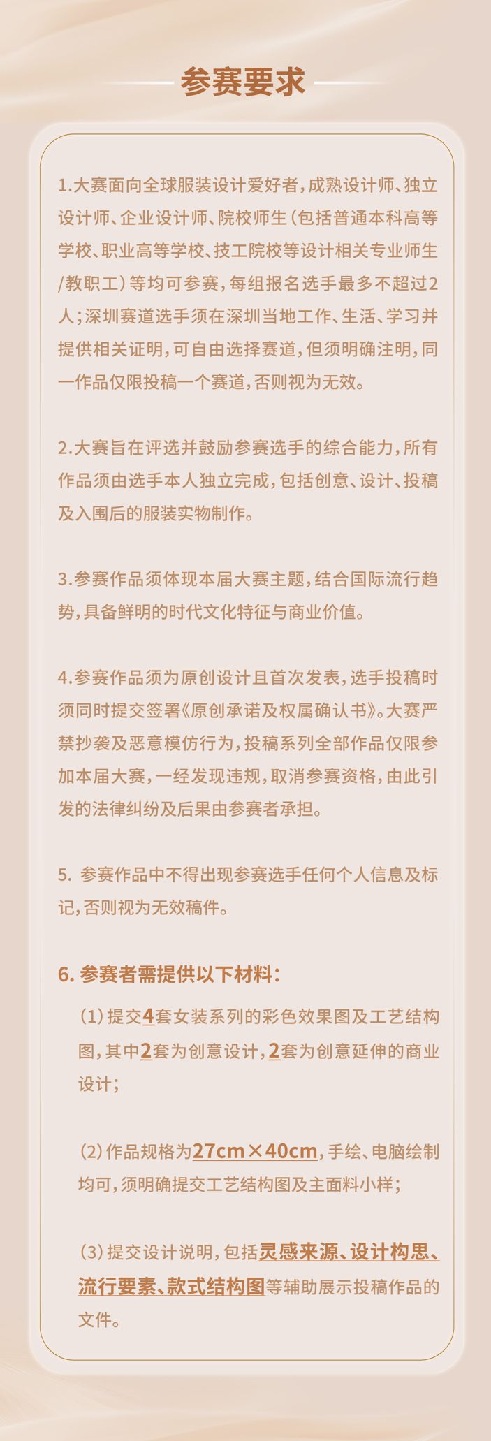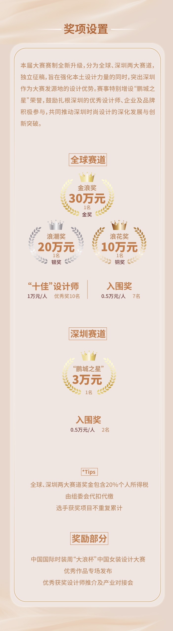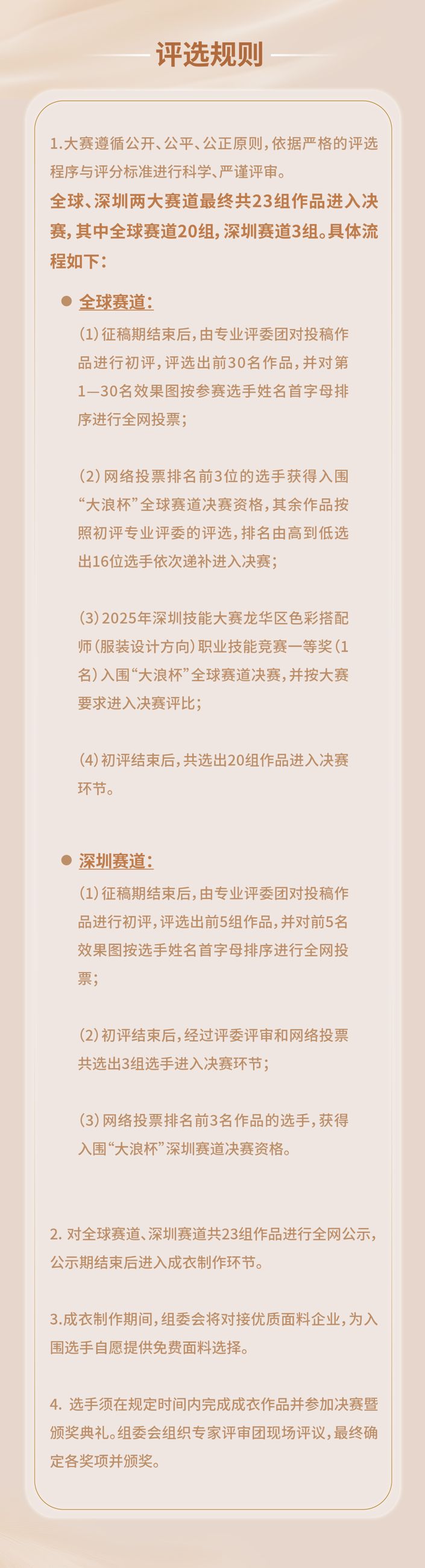 两个赛道均独立征稿,全球赛道面向各个国家及地区的服装设计爱好者,成熟设计师、独立设计师、企业设计师、院校师生征稿;深圳赛道则面向深圳当地时尚企业,以及工作、生活、学习的设计师人才。赛事特别增设“鹏城之星”荣誉,鼓励扎根深圳的优秀设计师、企业及品牌积极参与,共同推动深圳时尚设计的深化发展与创新突破。