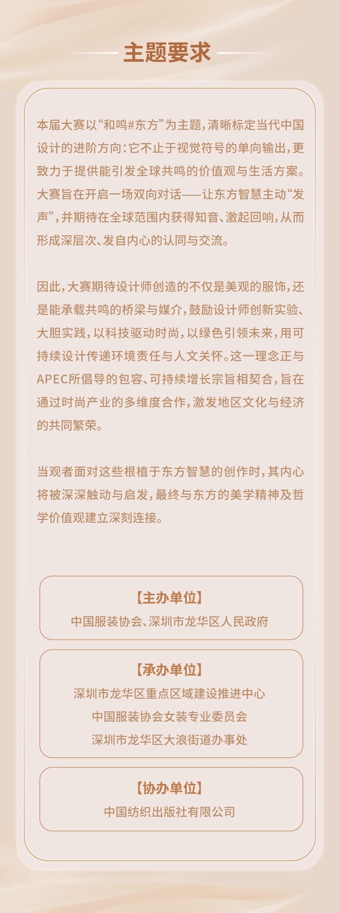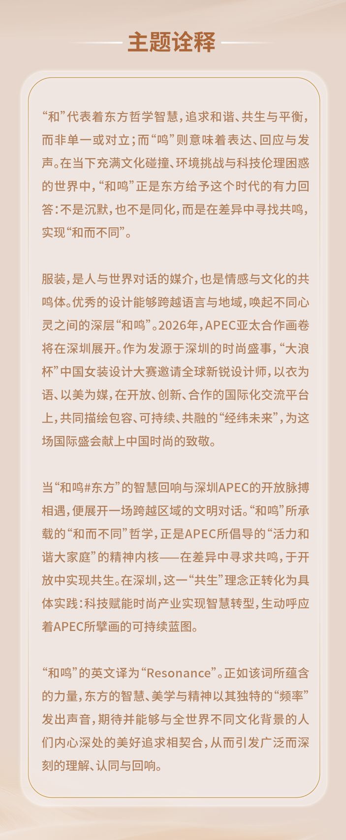 全面升维的第十五届“大浪杯”中国女装设计大赛,将打造文化战略平台。大赛全新的主题“和鸣#东方”,“和”代表着东方哲学智慧,追求和谐、共生与平衡,而非单一或对立;而“鸣”则意味着表达、回应与发声。在当下充满文化碰撞、环境挑战与科技伦理困惑的世界中,“和鸣”正是东方给予这个时代的有力回答:不是沉默,也不是同化,而是在差异中寻找共鸣,实现“和而不同”。