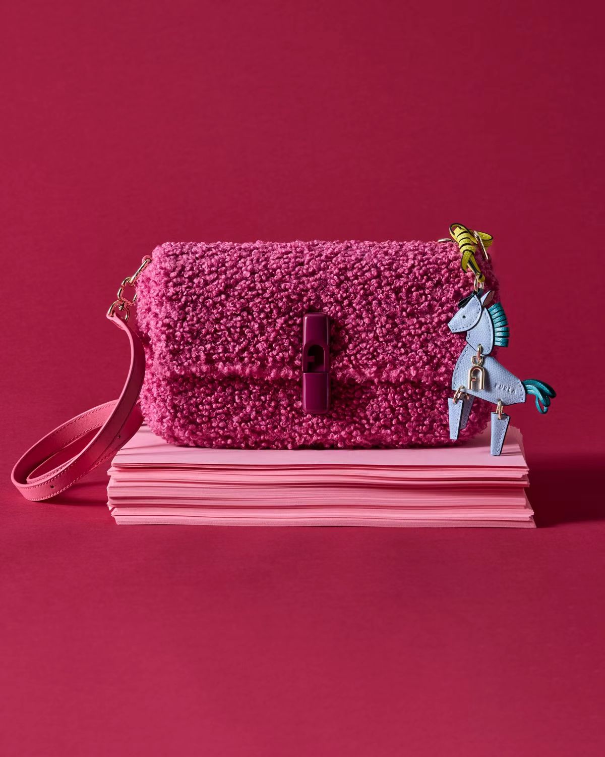 FURLA IRIDE系列斜挎包化身为一匹闯入时尚视野的「暖绒小驹」以柔软的泰迪毛绒材质演绎冬日最软糯的时尚态度,该包款不仅在新一季加入了俏皮的泰迪织物元素,并结合小巧廓形包型设计及金色金属包扣,进一步提升精致度,成为理想的冬季亮眼单品:舒适、柔软且时尚,点亮新春氛围感穿搭,为新年注入无限活力。