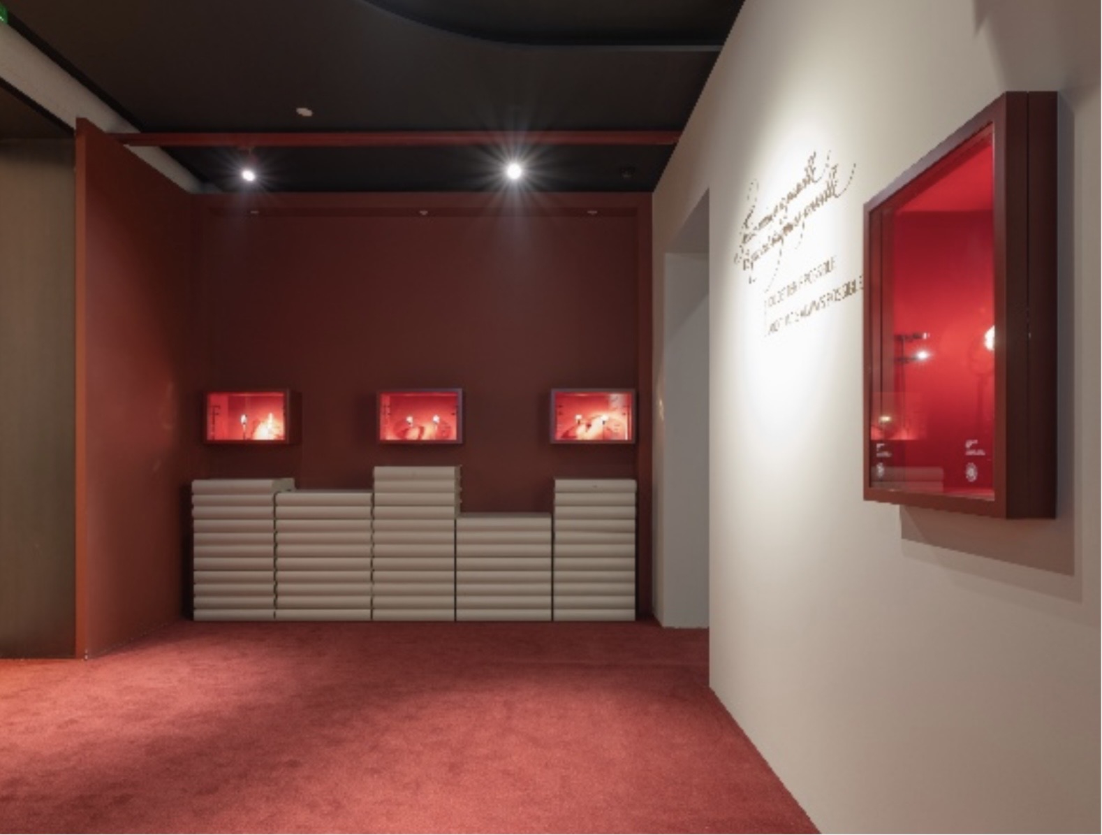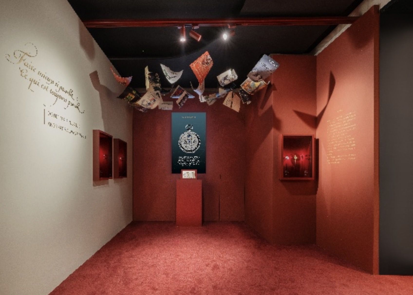 驻足于展厅正前方,即可透过入口一览内景精妙的陈列与马耳他十字交织的光影氛围。步入展厅,映入眼帘的即为此次体验空间的首章——「传奇源起」。展区两侧饰以飞舞的档案与书页,其灵感源自1755年,品牌创始人Jean-Marc Vacheron先生签下的首份招收学徒的契约,标志着江诗丹顿追求卓越制表的“臻途”由此启程。