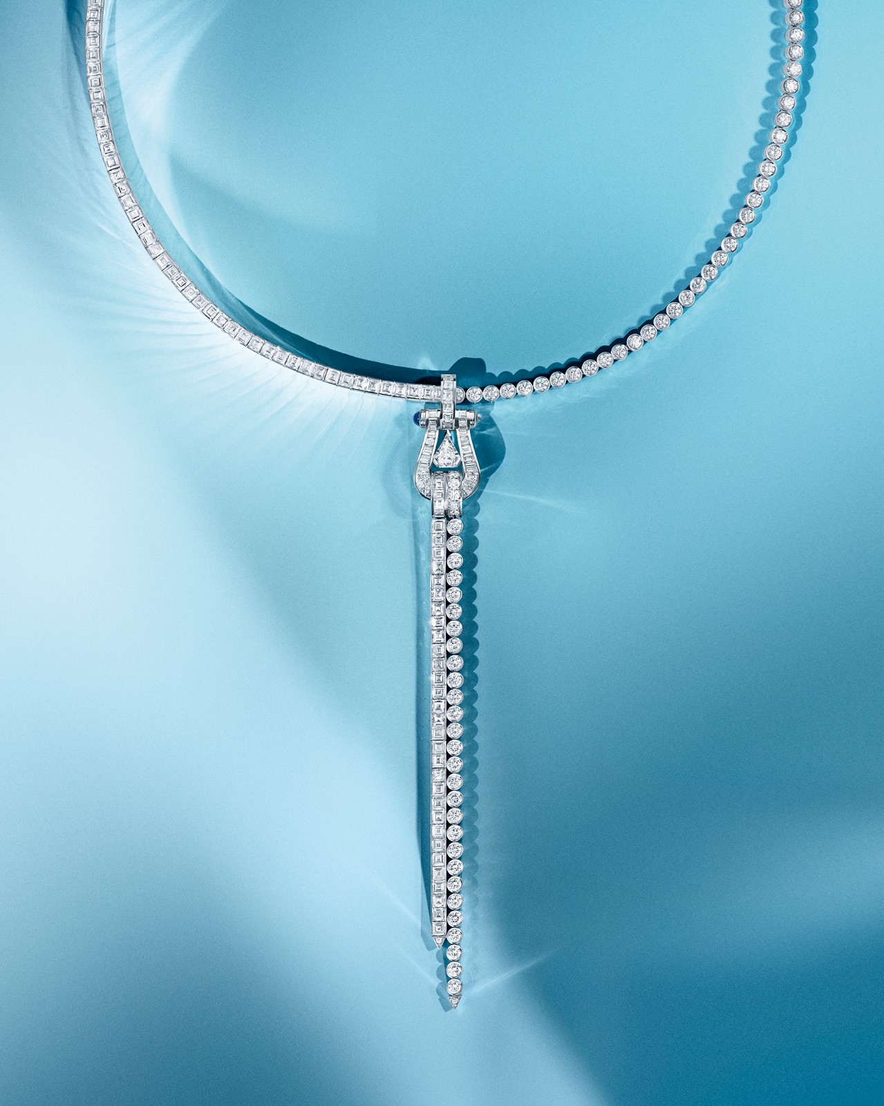 该主题作品的设计灵感源自“咆哮的二十年代”舞会的流光溢彩,提供白金和黄金两种材质选择。项链的链绳与流苏的穗饰,缀有镶饰圆形明亮式切割钻石的纤细条饰,使其熠熠生辉。密镶钻石的航海扣设计中央更点缀一颗圆形切割钻石,赋予作品灼灼光华。它们兼具流动的线条、柔韧的姿态与随步生辉的光芒,其柔美气质亦呼应着Force 10系列的起源:一个因爱而生的珠宝系列。