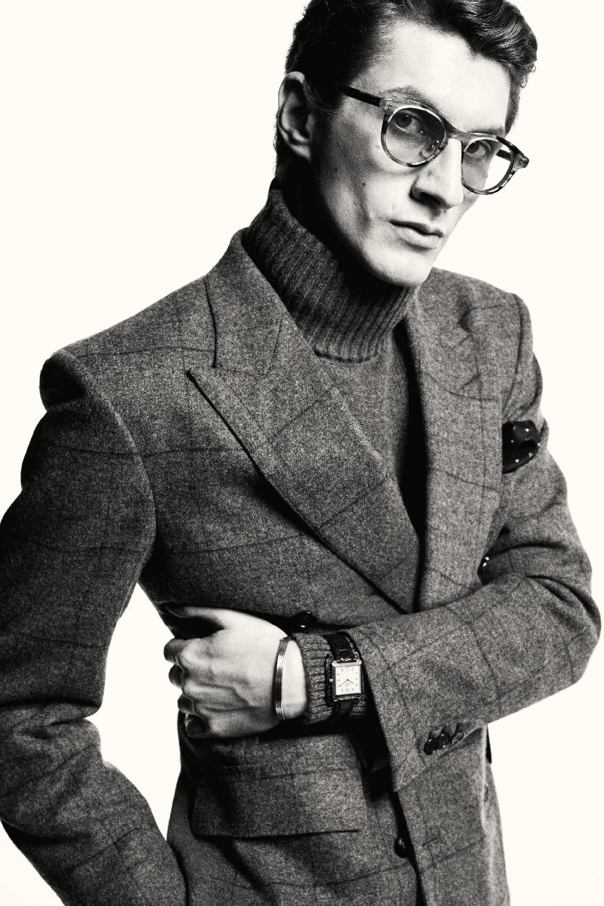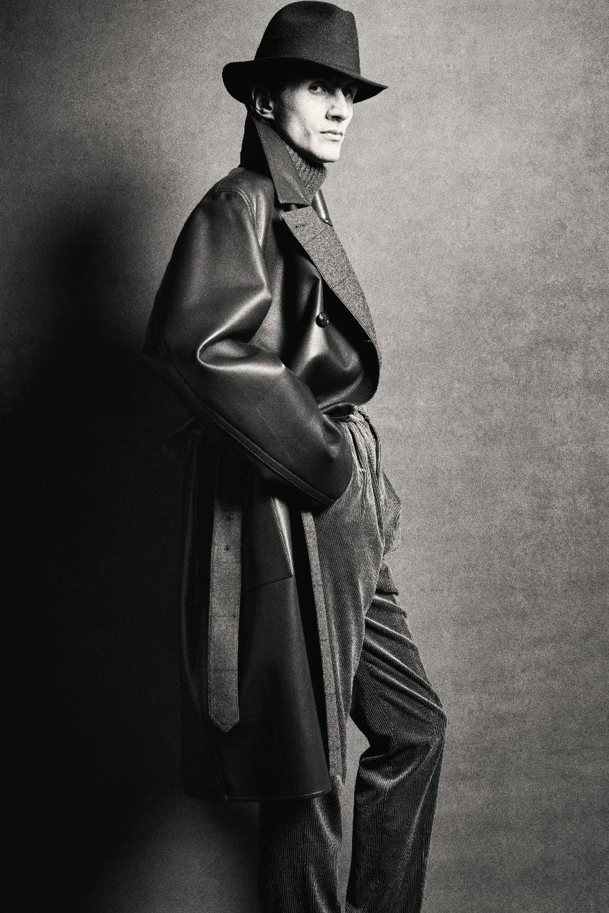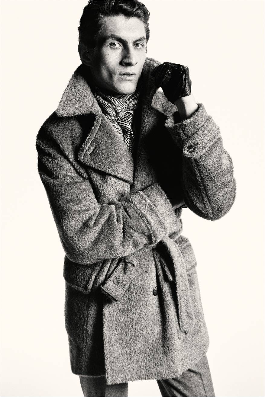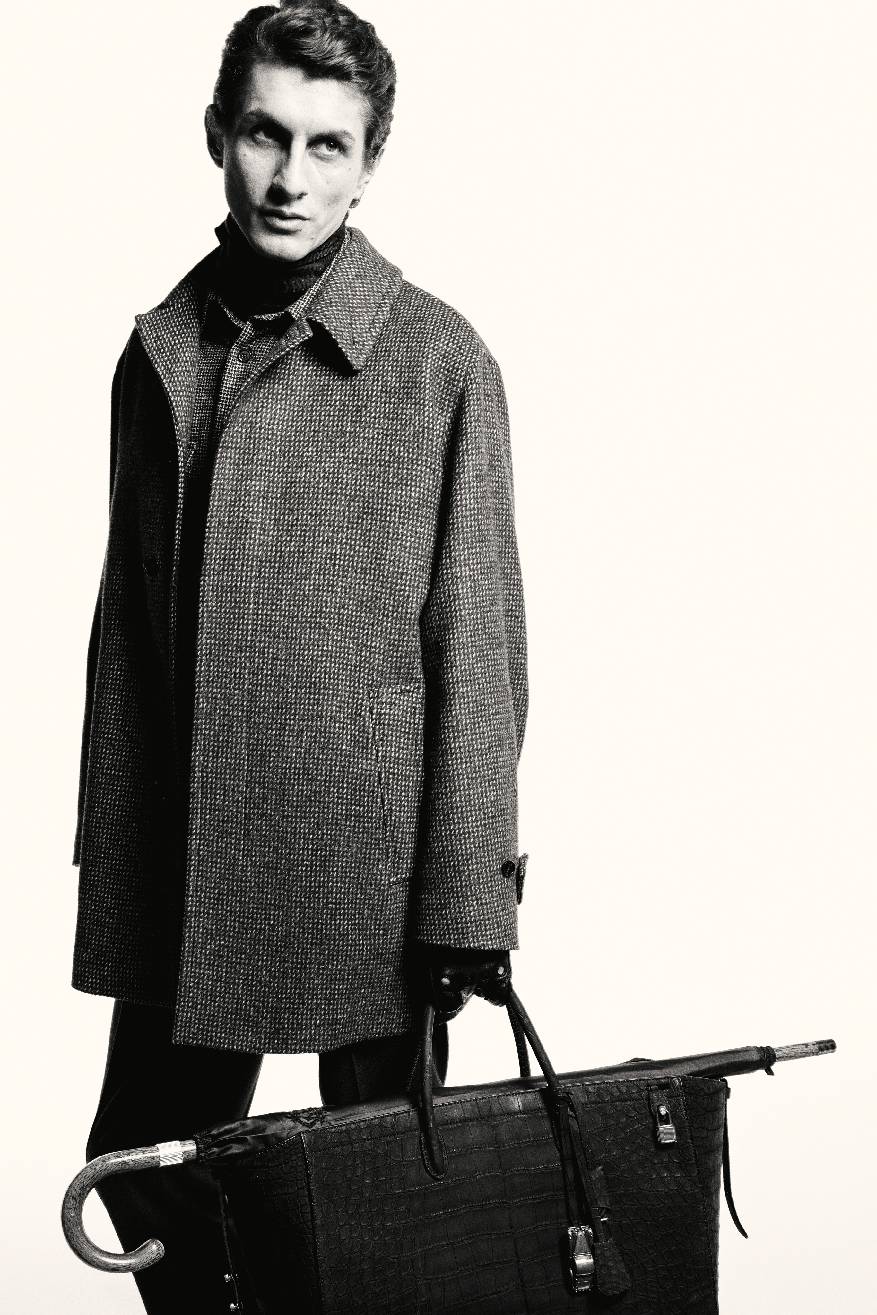 叙事基调再度转入深邃,整体设计显露愈发深沉的电影张力。冬日暖棕与炭黑色的窗格纹或细条纹裁剪款式,搭配多层叠穿的超细翻领羊绒衫、斜纹衬衫与围巾,于氛围转折间映射绅装华贵气度。