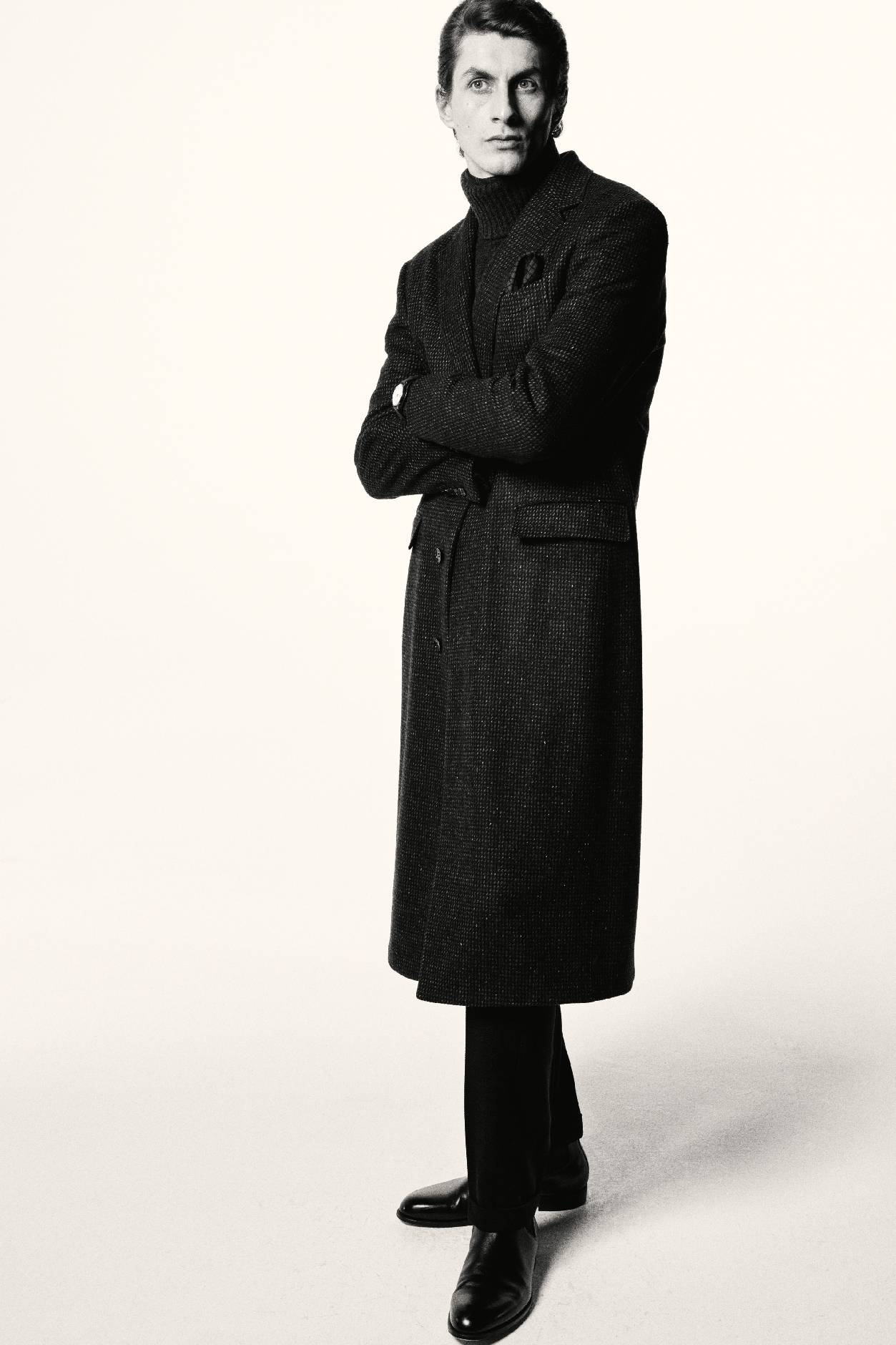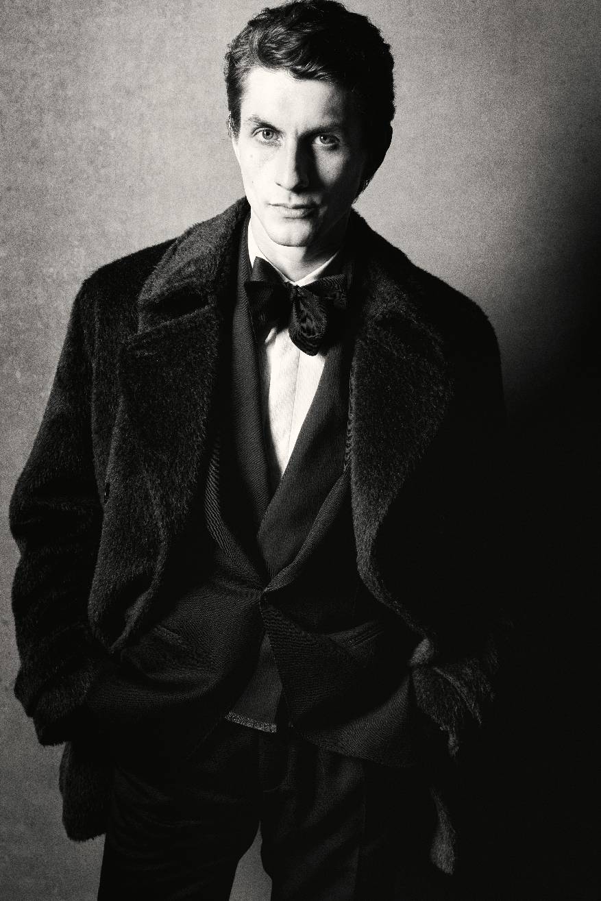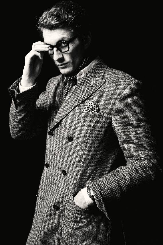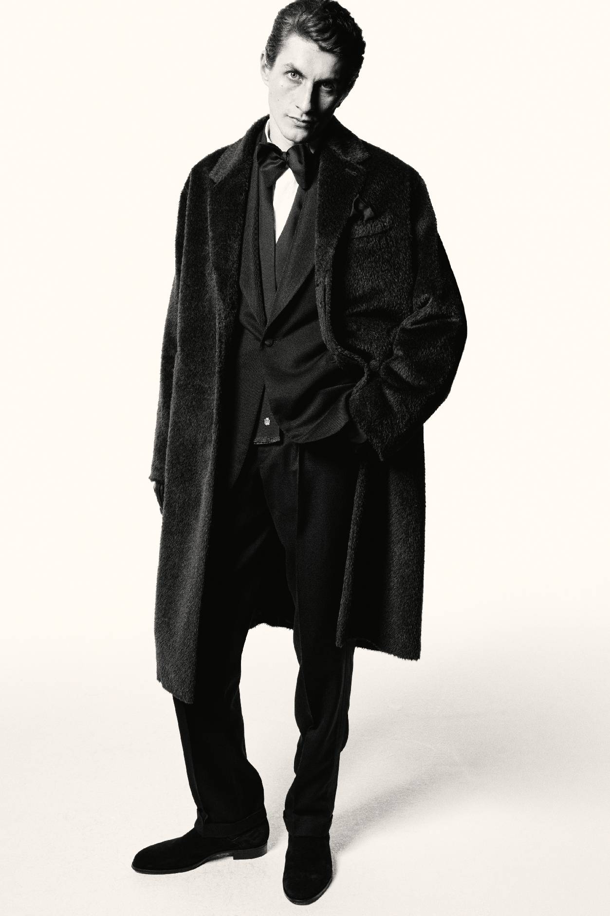 叙事基调再度转入深邃,整体设计显露愈发深沉的电影张力。冬日暖棕与炭黑色的窗格纹或细条纹裁剪款式,搭配多层叠穿的超细翻领羊绒衫、斜纹衬衫与围巾,于氛围转折间映射绅装华贵气度。