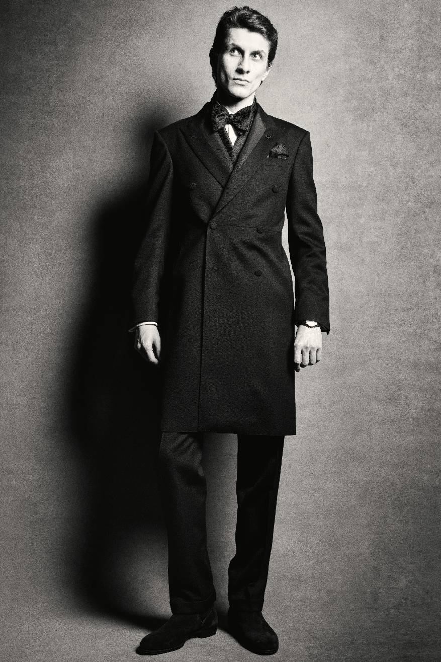 晚装篇章延续经典奢华格调,诠释正装典范。高领扣款双排扣天鹅绒晚礼服夹克、Barathea羊毛长礼服外衣以及午夜棕、蓝色与黑色无尾礼服,与粗犷的皮毛一体飞行员夹克、色调浓郁的羊驼呢汽车大衣等飒爽奔放的外套叠穿混搭。