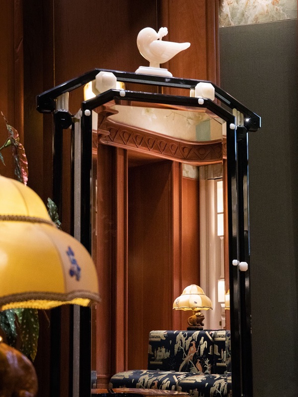 与旅英艺术家杨宇合作共创《海上繁花》主题画作,为二楼沙龙空间定调,从鎏金手绘天顶壁画到缂丝壁灯,层层递进,浸润着岁月沉淀的风华。有此二作为开篇点题,余下景物,皆藏于阁中转角与光影之间,待你步步相逢。