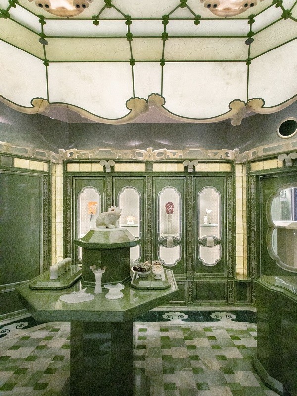 空间深处,“蓬莱”一境悠然浮现。取意海上仙山之缥缈,整体以青玉构型,塑出如玉雕巨作般的温润体量。地面玉石、陶片与木材交织出云纹肌理;立面浇筑玻璃流转着青绿薄雾;穹顶光影漫如云霭,托起空间悬浮之感。从竹节玉框至云纹栏干,细节皆承传统玉雕工艺,将仙山意象化为可居可游的静域,引人驻足凝神。