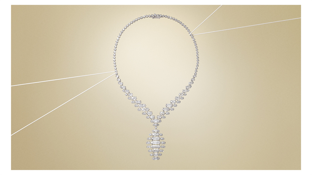 精妙匹配的宝石,与方形切割、长方形切割和圆形明亮式切割钻石交相辉映,共同诠释作品的抽象设计风格。项链背面的搭扣可在两条链带之间自如滑动,呈现流畅垂坠感,并可灵活调节项链长度。镂空图案、几何造型与宝石的交错排布为作品赋予强烈的韵律感,令整件作品焕发出珍贵而生动的活力。