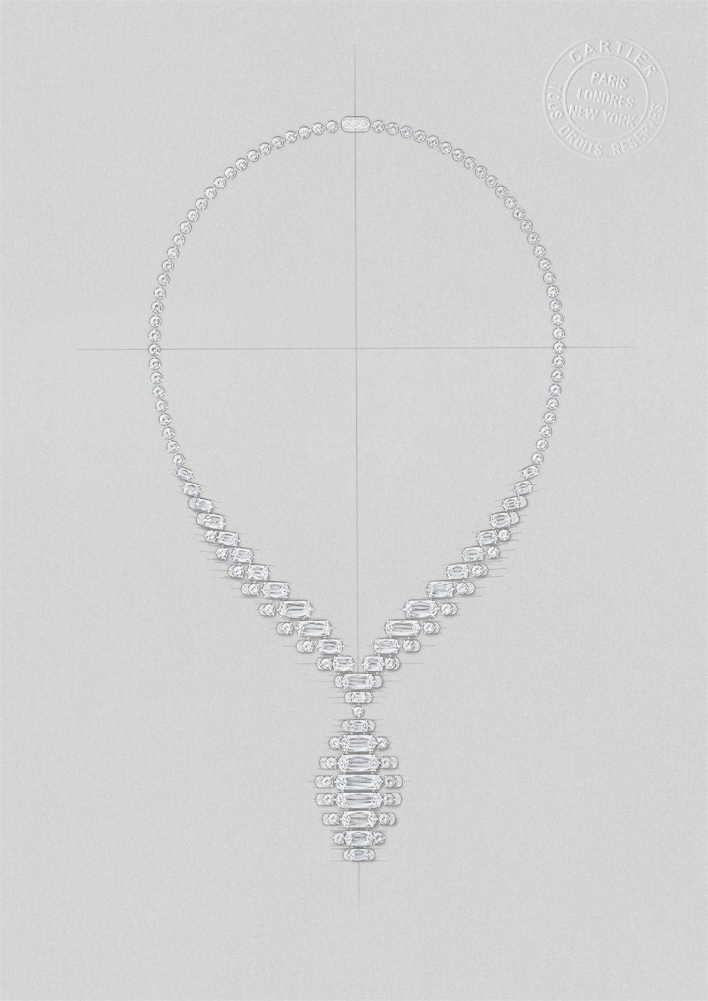 项链的正面和背面均点缀着精巧流苏垂饰,彼此呼应,姿态优雅。背面的流苏元素采用可调节设计,彰显卡地亚的精湛工艺,同时延续品牌可转换珠宝的设计传统。这件流畅灵动的珠宝设计灵感源自水母,它随波游弋的姿态经卡地亚的巧妙演绎,凝练为抽象风格图案。