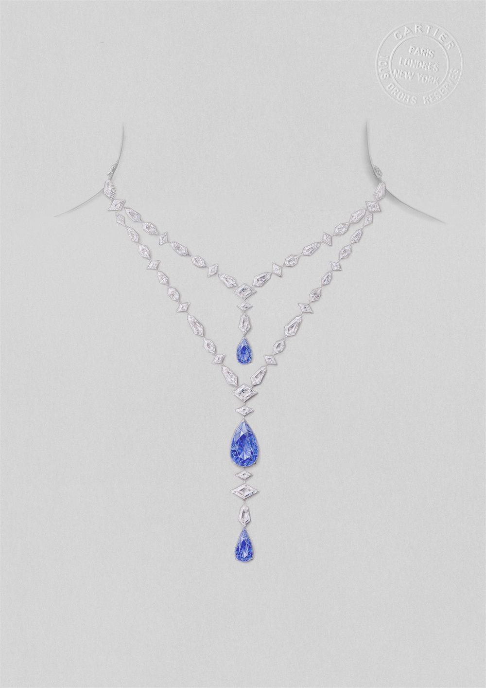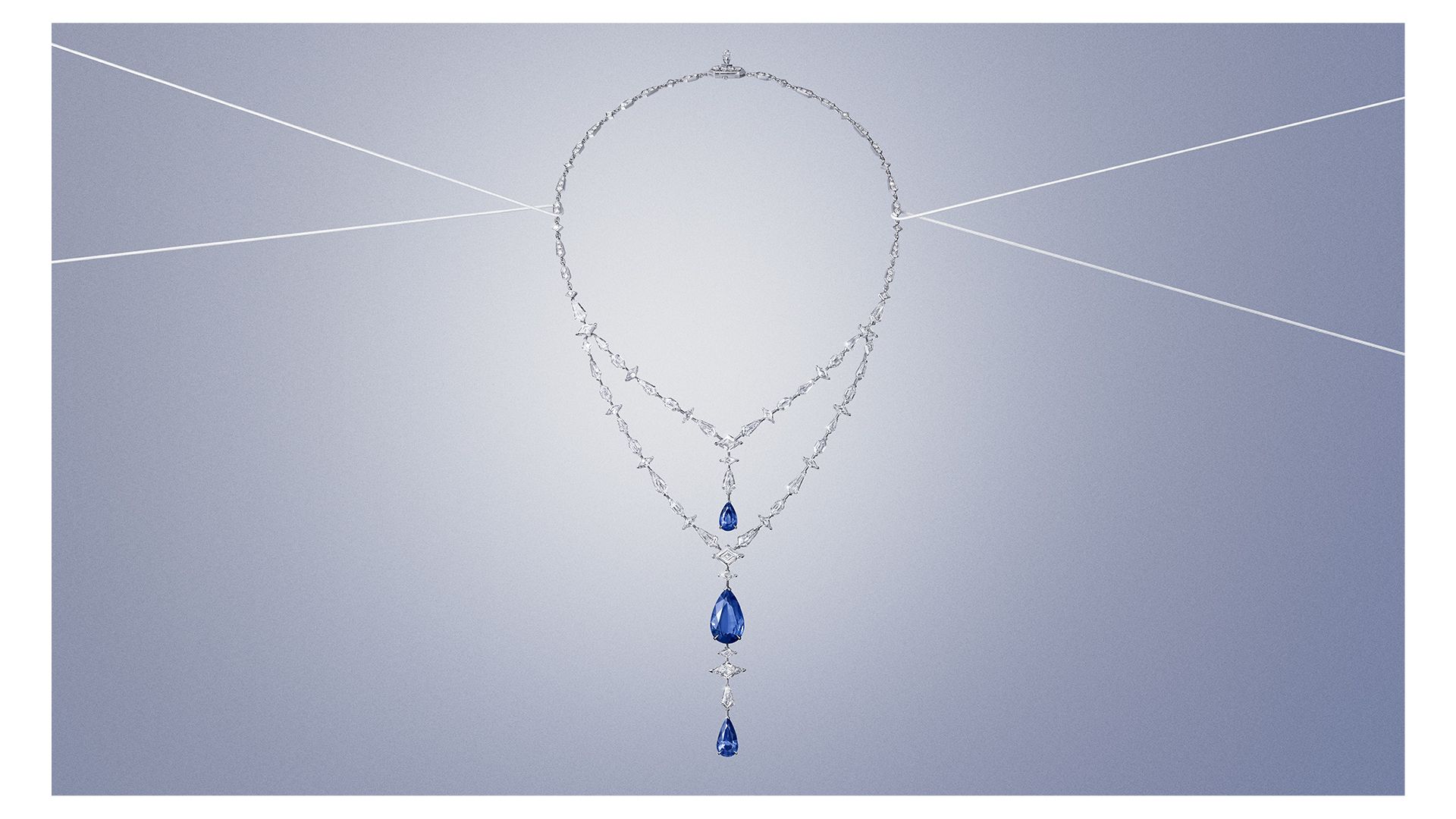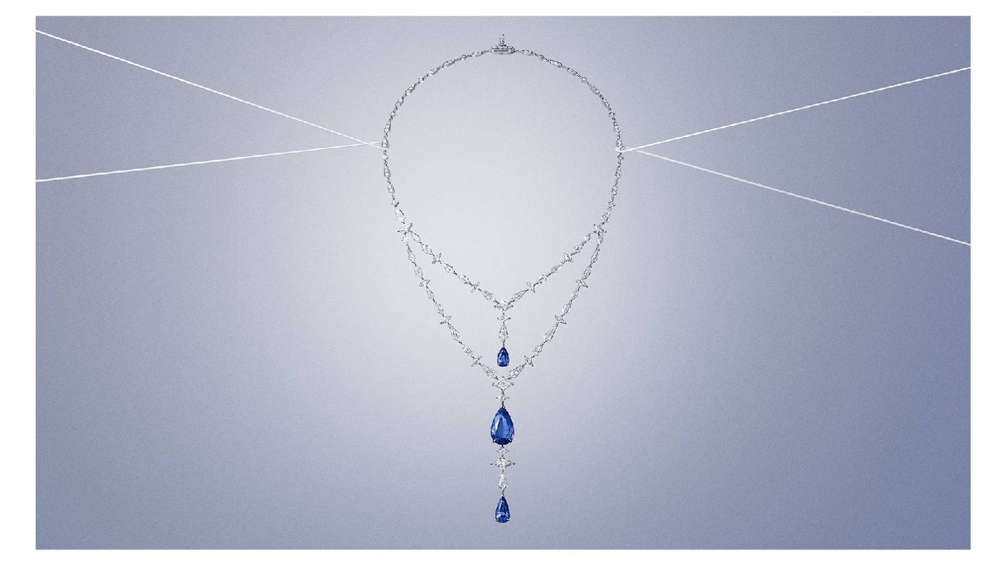 一系列钻石线条向三颗水滴般的蓝宝石汇聚,构型极具张力。这些线条由风筝形、菱形与圆形明亮式切割钻石交错排列而成,为整件作品带来生动韵律与丰富层次。