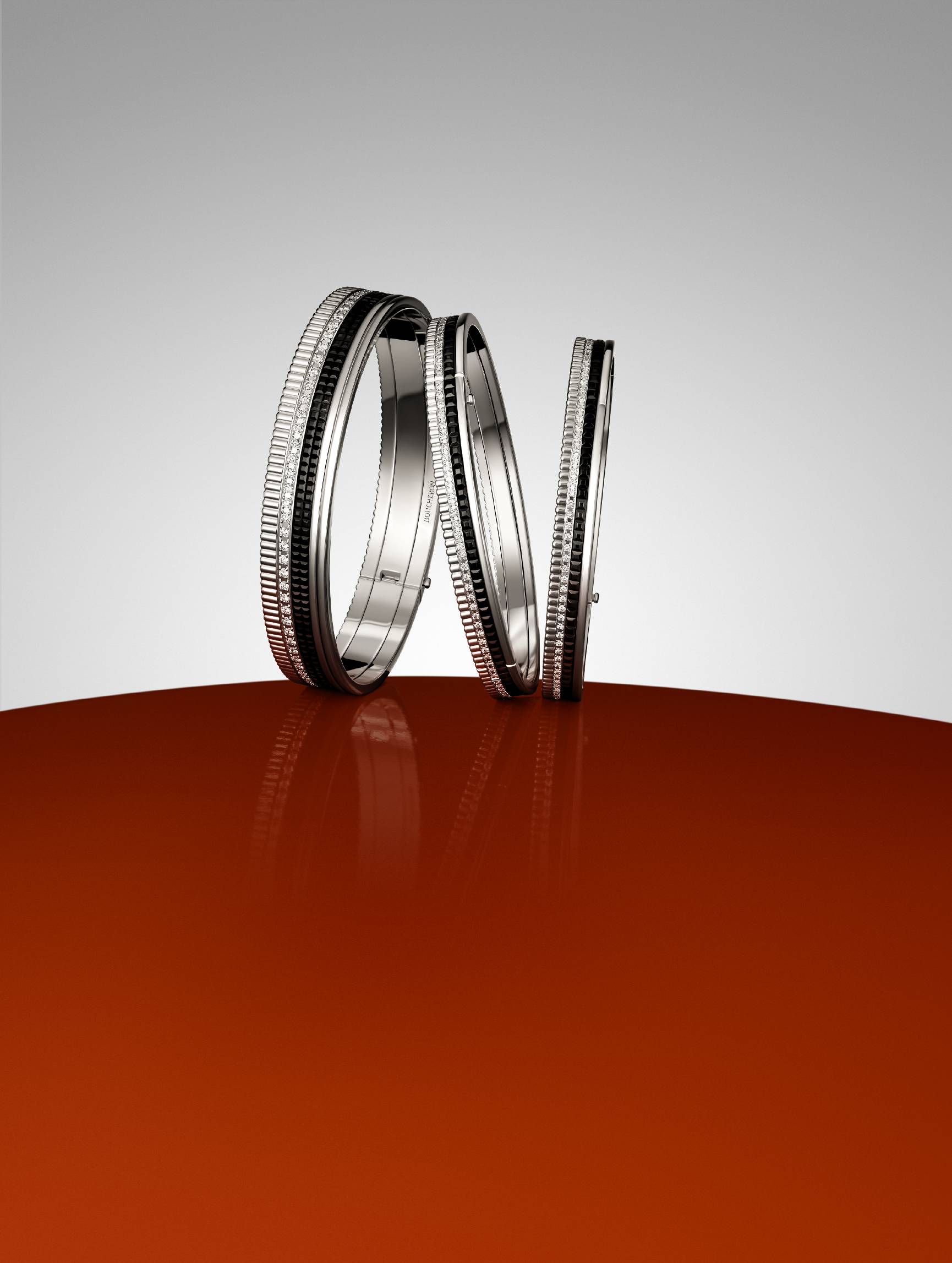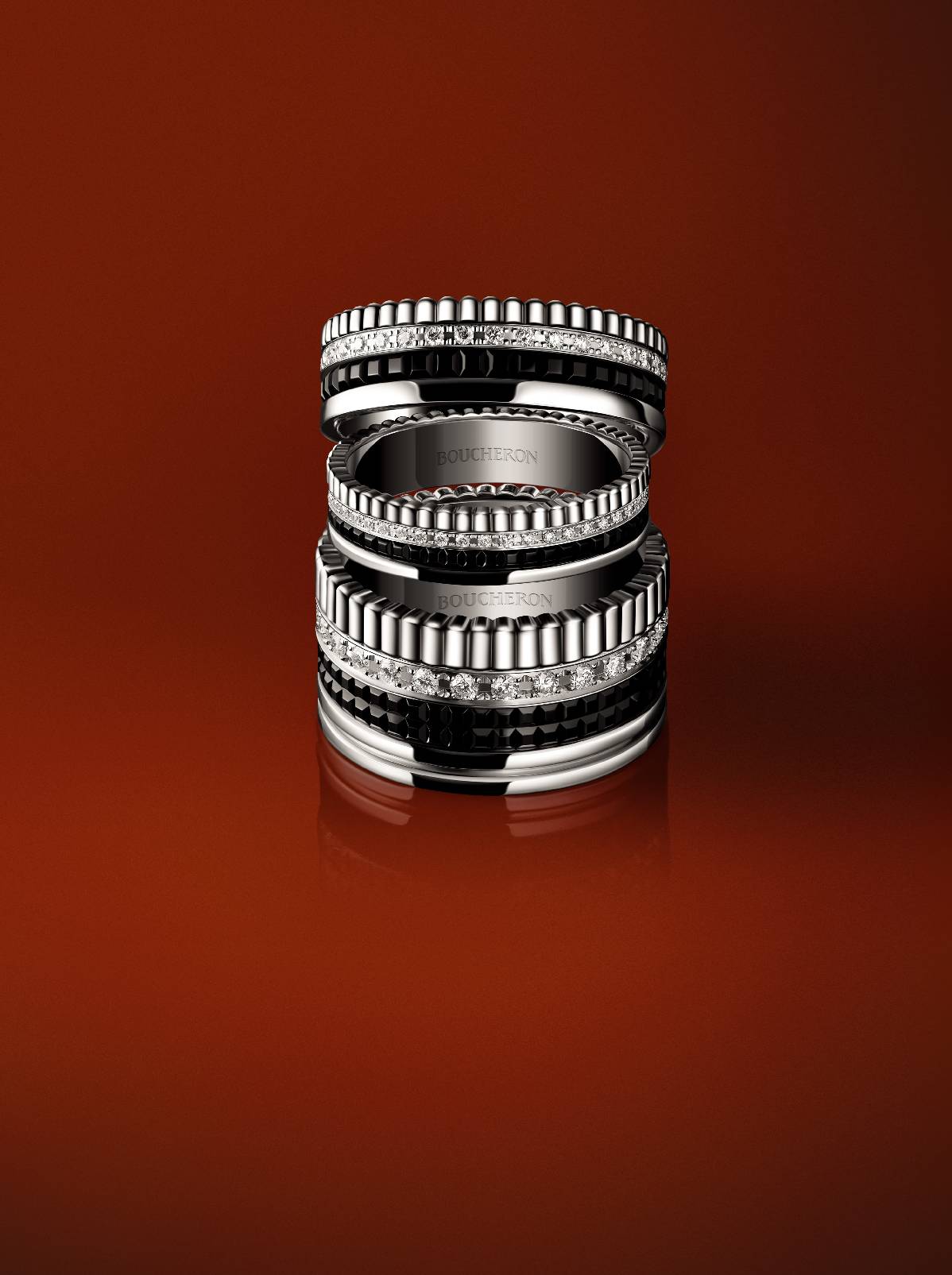 Quatre Classique系列戒指,迷你款 采用黄金、玫瑰金、白金及 棕色PVD镀层,铺镶钻石 | Quatre Black系列戒指,迷你款 采用白金及黑色PVD镀层, 铺镶钻石 | Quatre Black系列手镯,小型款 采用白金及黑色PVD镀层, 铺镶钻石 |