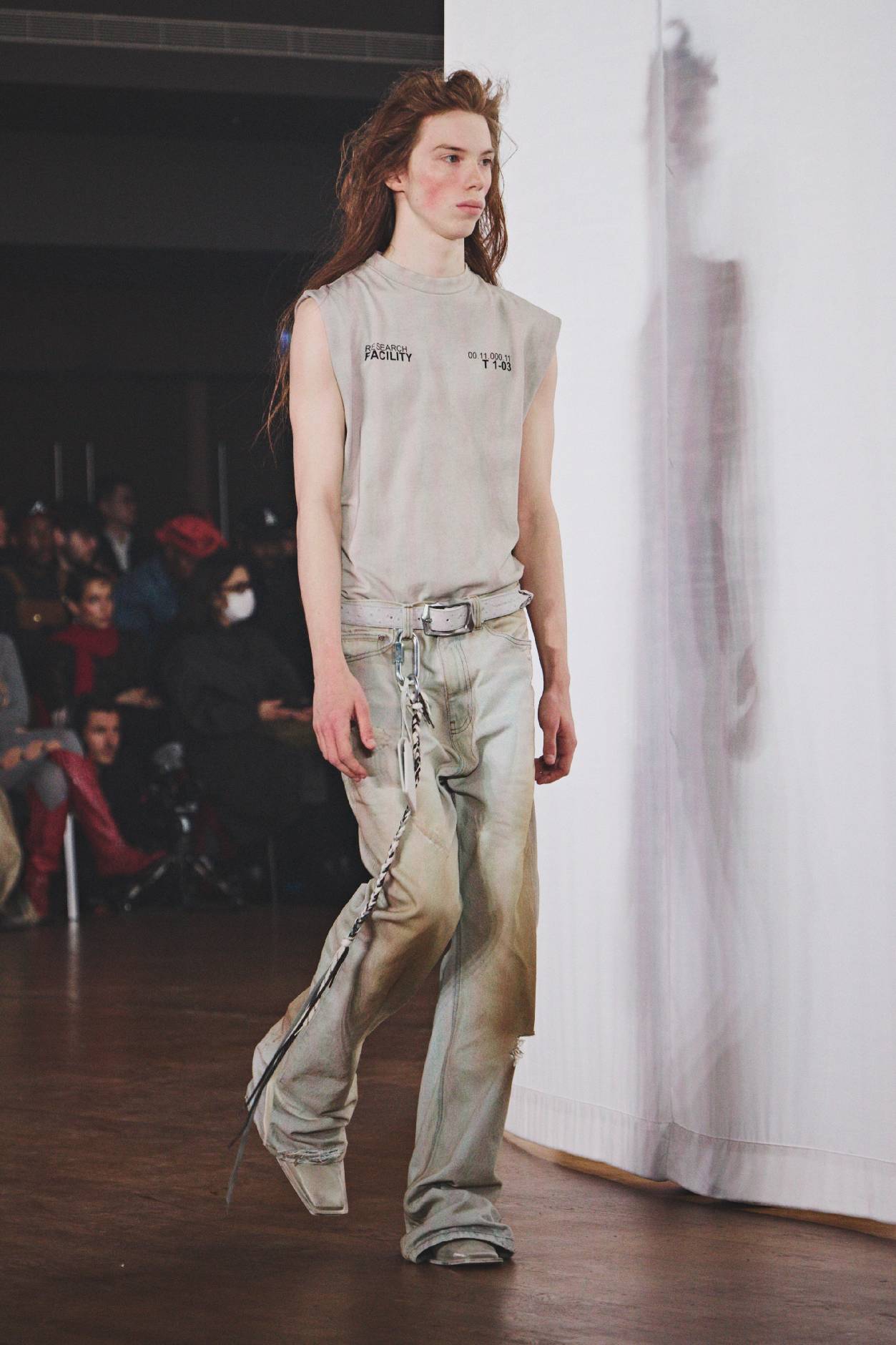 廓形在紧缩与松垮间飘摇,覆以破损处理与多样洗染技艺。系列浸透私密叙事感,却维系着近乎偶然的和谐。冷调磨损色系铺陈棕、白、灰与浅蓝,极光粉与石油绿如惊鸿一瞥。瞩目材质涵盖风化白色鸵鸟压纹皮革、重磅蜡棉、长绒羊毛、标志性刷色皮革,以及经过处理与经典印花的丹宁作品。