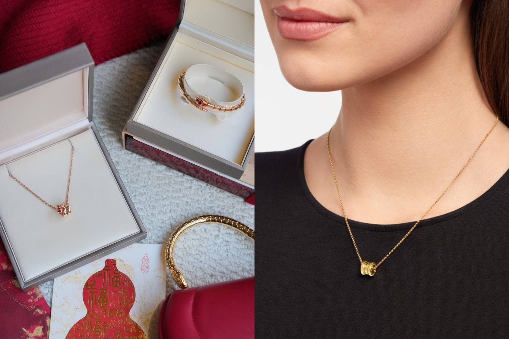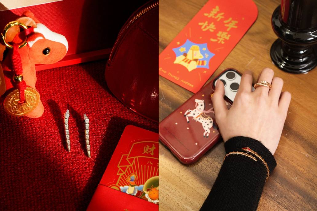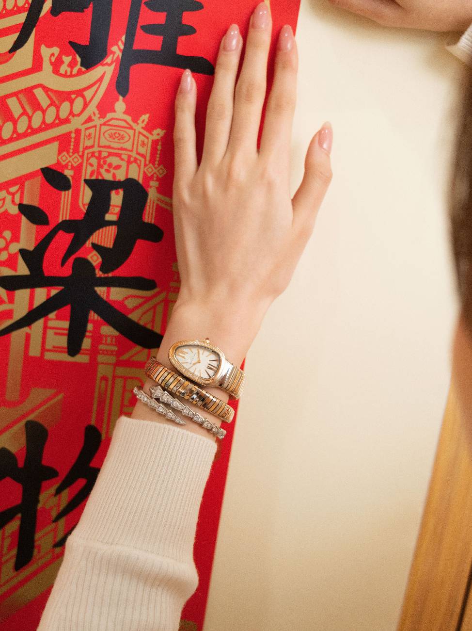 B.zero1 的螺旋造型以连续延展的线条,呈现一种不急于抵达的节奏感;Serpenti 的灵蛇形态,则以环绕姿态传递守护的意味。两者叠戴,在红色和金色的映衬下,形成既有张力又不失平衡的视觉语言,陪伴新一年稳步向前。