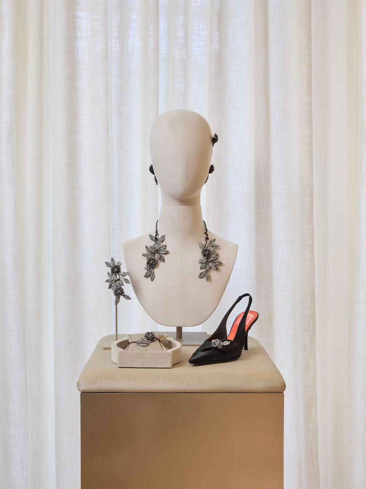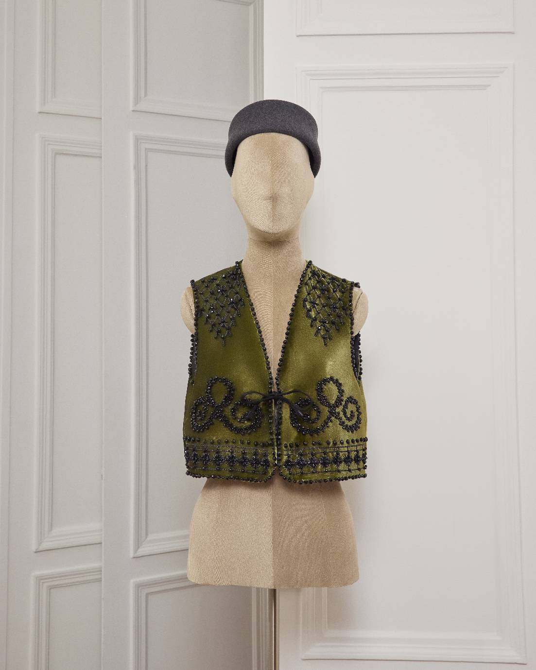 同款马甲系列成为本季造型语言中的重要篇章,呈现多重表达:刺绣款灵感源自罗杰·维维亚先生于 1950 年代打造的华丽鞋履,以绳饰滚边与水晶珠饰重塑经典轮廓,在繁复装饰与严谨结构之间取得精妙平衡;而燕尾式马甲则以利落、精准的剪裁线条勾勒身形,点缀镶嵌水晶铺镶的金属玫瑰纽扣,于克制之中释放锋芒。