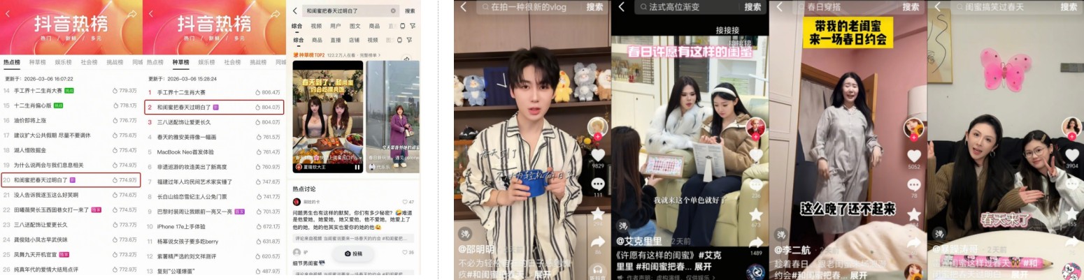 餐饮探店、春日穿搭、美甲焕新、商超打卡……围绕春日闺蜜局,这些视频里藏着无数可复刻的逛春灵感:和闺蜜吃漂亮饭怎么拍都出片的氛围感技巧、坐上闺蜜副驾的春日兜风攻略、被闺蜜宠爱的那些暖心小日常。#和闺蜜一起把春天过明白了 的话题就这样悄悄热了起来,一路冲上抖音热点榜TOP20、种草榜TOP2,活动期间话题曝光超1076.8w+,在榜时长超12小时。不仅让「和闺蜜逛春天」成为春日最流行的社交方式,更让大家解锁了诸多春日美好玩法,和闺蜜吃漂亮饭的氛围感出片技巧、坐上闺蜜车的春日兜风攻略、被闺蜜宠爱的暖心日常……原来春天,竟有这么多温柔美好的打开方式。