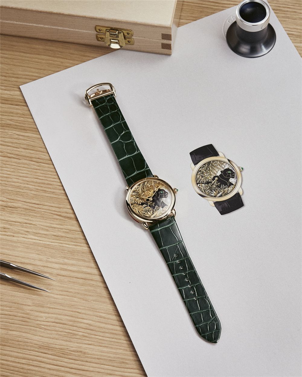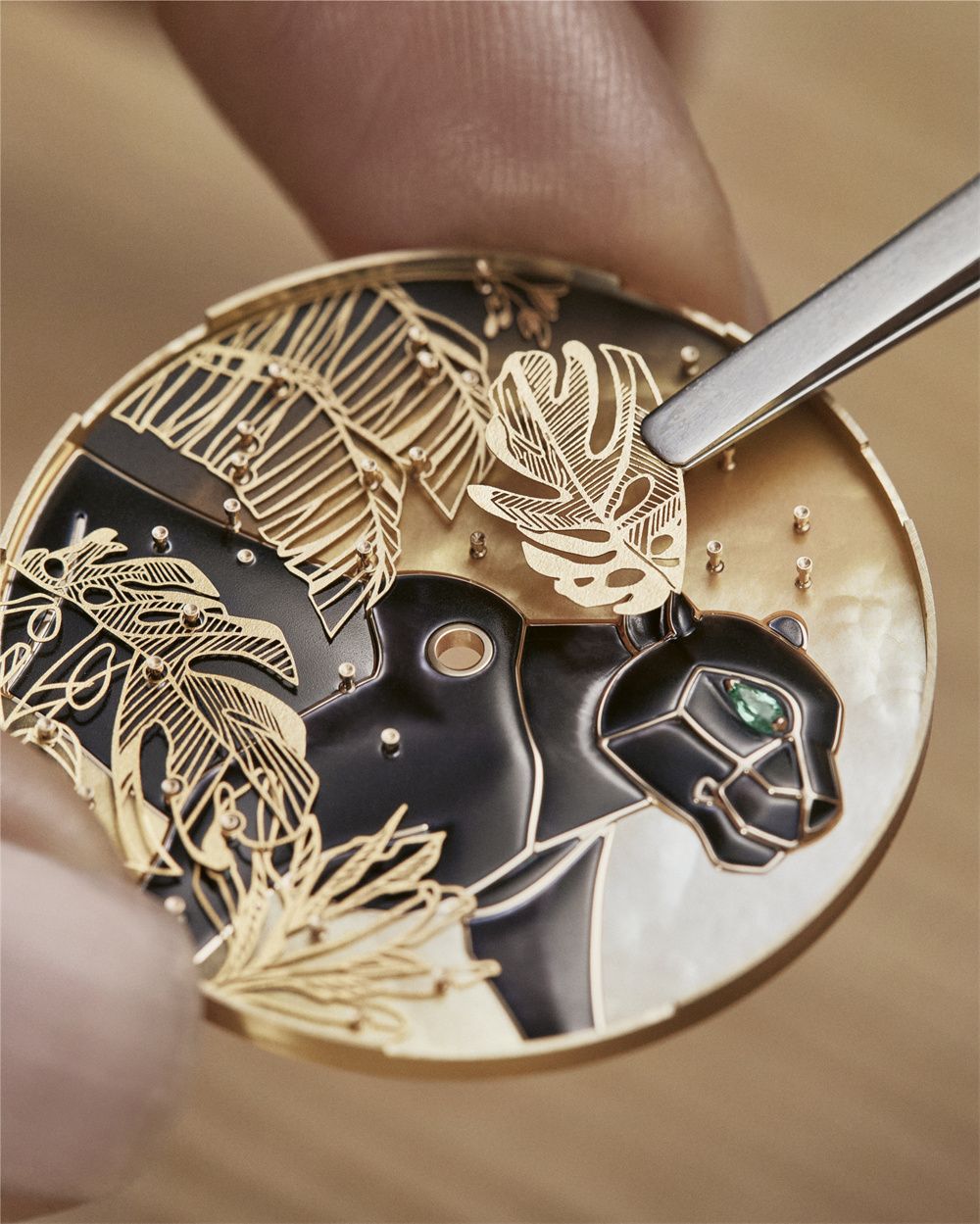 为了打造这款腕表,卡地亚工匠挥洒才思技艺,以黑色漆艺珍珠母贝生动刻绘猎豹,令这一标志性动物仿佛从珍贵的丛林中现身。工作坊历经三年多的探索与技术研究,方才掌握了打造这片繁茂的金箔丛林所需的工艺。