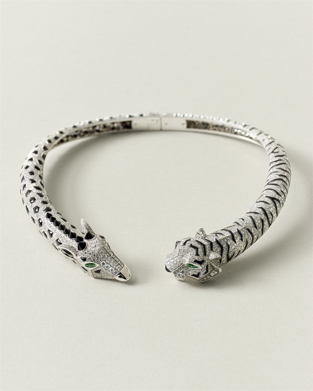 一只舒展身躯的老虎幻化为项链,而卡地亚精湛的珠宝工艺则为之赋予蓬勃的生命力:黄色、橙色、棕色和白色钻石逼真还原老虎皮毛的自然色泽,形状各异的缟玛瑙则构成斑纹;雕塑工艺勾勒出精致轮廓,塑造生动的立体造型;祖母绿虎眼炯炯有神;一只灵活自如的铰接式虎爪轻抚肌肤,展露自信沉着的姿态。