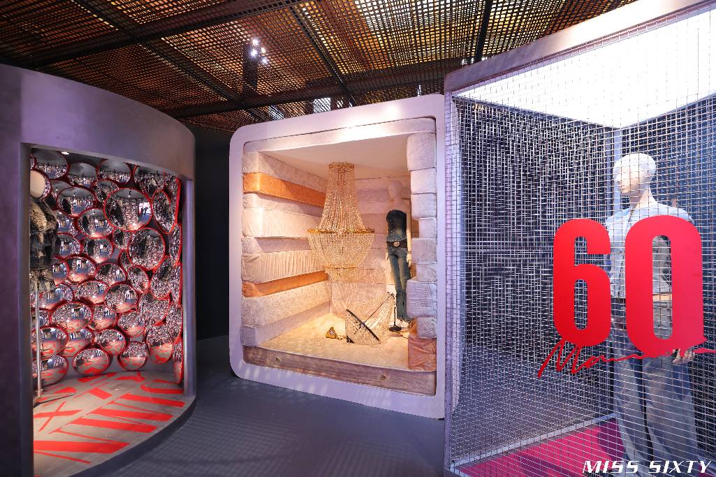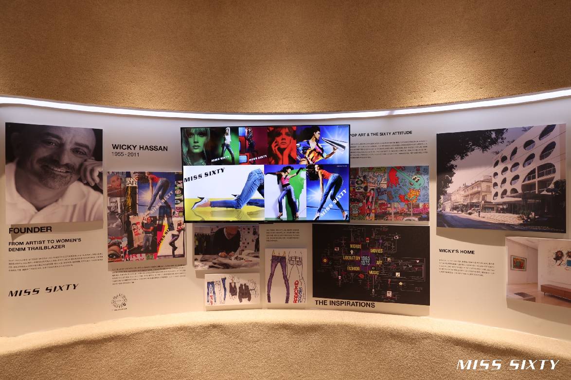 步入空间,率先开启的是品牌精神溯源之旅。作为全球第一个专为女性打造的丹宁品牌,MISS SIXTY 1991 年诞生于意大利,更是全球首个将莱卡面料运用于牛仔设计的品牌,彻底将牛仔裤从男性工装转化为女性丹宁的代表。展区完整讲述了 Wicky 从 1983 年在罗马创立 Energie 开启先锋设计实践,到 1991 年正式创立 MISS SIXTY 的历程,包括品牌首条致敬猫王的 “Memphis” 牛仔裤背后的创作故事。