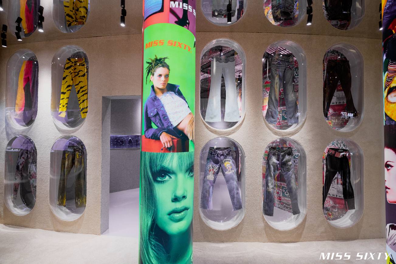 循着动线深入,丹宁档案馆展区为观众解锁了藏在丹宁细节里的波普基因。诞生于流行文化迅速扩张的年代,MISS SIXTY 始终将牛仔裤作为态度表达的载体,凭借鲜明独立的设计语言,成为全球女性丹宁的代名词。展区集中呈现了品牌多款经典丹宁单品,拆解了不同波普艺术流派为设计带来的灵感启发,为品牌风格化丹宁设计注入了源源不断的灵感。