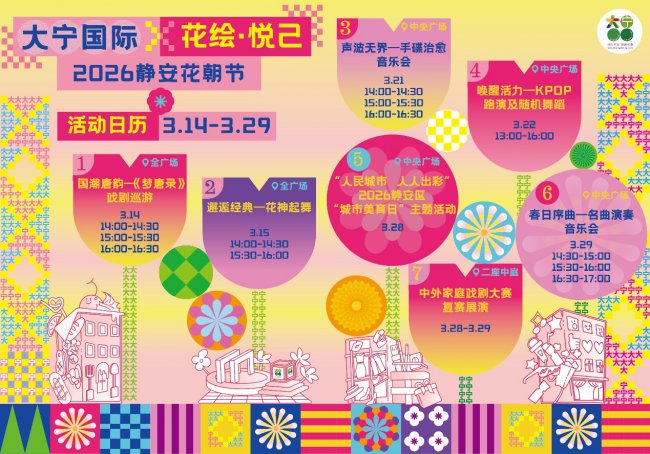 周末演出日历出炉,传统与潮流碰撞,古韵与新生交融。周周有精彩,日日有惊喜,让你在花海间尽享视听盛宴。3月14日,造梦马车剧团独家版权原创作品《梦唐录》高跷戏剧巡游邀你共赴盛唐之约,再现贞观开元的盛世气象。3月15日,穿越千年花语,邂逅十二花神,一场穿越时空的“贺花神”国风巡游即将启幕。八位身着华美服饰的经典花神踏春而来,组成精致巡游队伍穿行于大宁国际的街巷,更会在指定点位献上唯美定点演出。衣袖翩跹,裙裾轻扬,每一步都是诗词画卷,每一眼都是千年惊鸿。3月21日,当空灵的宇宙之音遇见郁金香花海,由“申田由甲·手碟”12人乐团倾情演绎,以手碟的即兴韵律为底色,融入人声吟唱与多元乐器,重构经典流行曲目,让空灵共振漫染花海。3月22日,KPOP热门曲目轮番炸场,爱豆级舞台氛围点燃春日活力。熟悉的旋律一响,DNA即刻启动跟着一起放肆舞动,尽情释放潮酷魅力。3月28日,静安区文化馆将以“城市美育日”为契机,将中央舞台及商户空间转化为美育阵地,实现“购物休闲+文化体验”双向融合,让市民在日常休闲中也能便捷感受艺术滋养。3月29日,由欧洲留学归国的青年演奏家组成专业室内乐团倾情呈现,带来柴可夫斯基《花之圆舞曲》等十余首经典曲目,从西方古典华章到温情治愈旋律,让高雅艺术与都市春光完美交融。此外,3月28日-3月29日,2026年中外家庭戏剧大赛复赛展演,把生活里的小美好搬进舞台,让戏剧的魅力点亮日常。