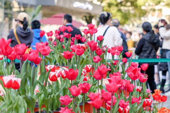 大宁国际将春日的浪漫藏进每一个角落,从中央广场到南、北广场,成片的郁金香如约绚烂盛放。红的妍丽动人、粉的轻柔似云、金蕊点点如碎金闪烁,都像是刚从春光里淬炼出的色彩。目光所及之处皆是繁花织就的锦绣,放缓脚步,任由自己徜徉在这片触手可及的春日梦境里,时光也似乎变得柔软起来。