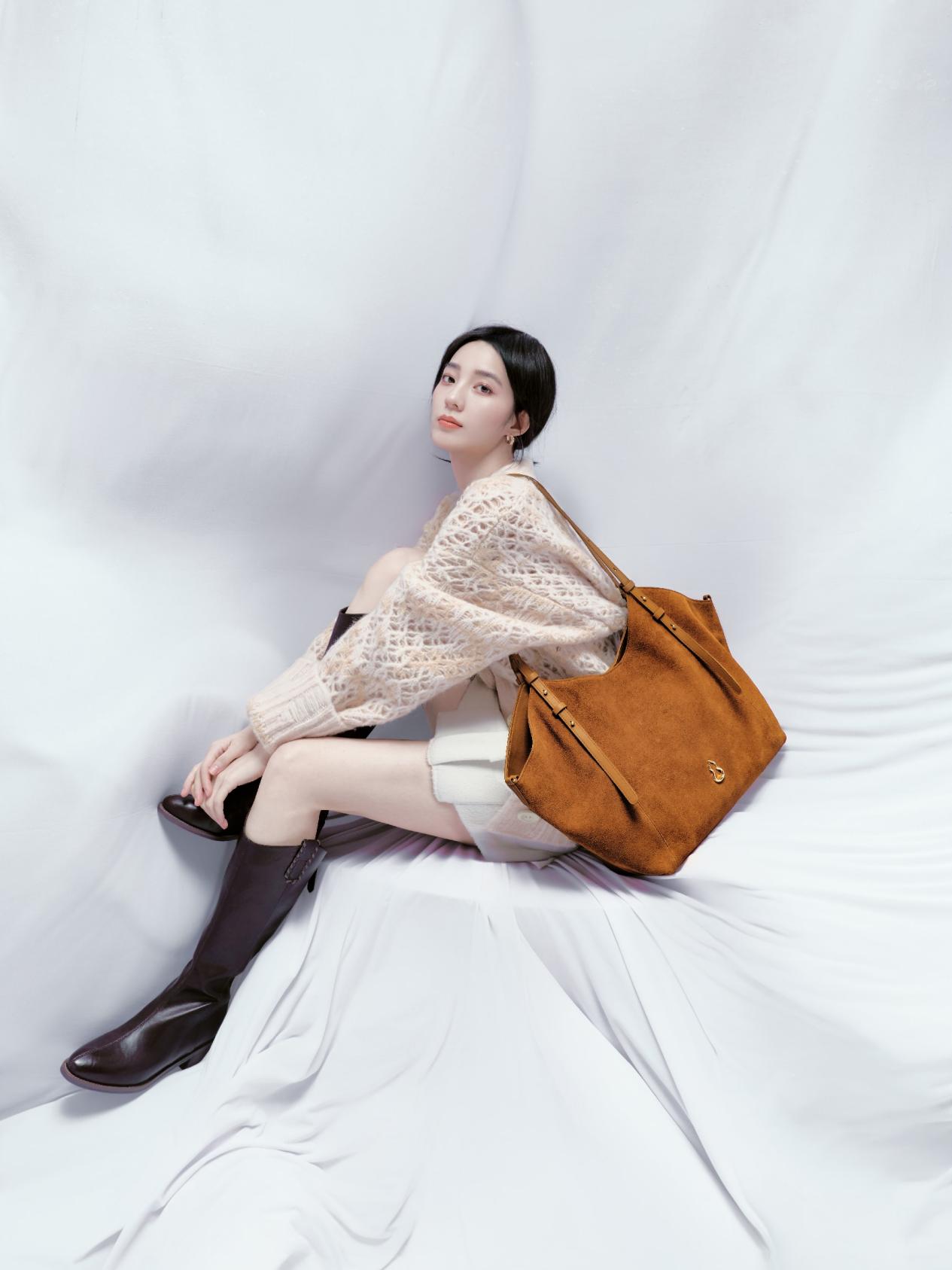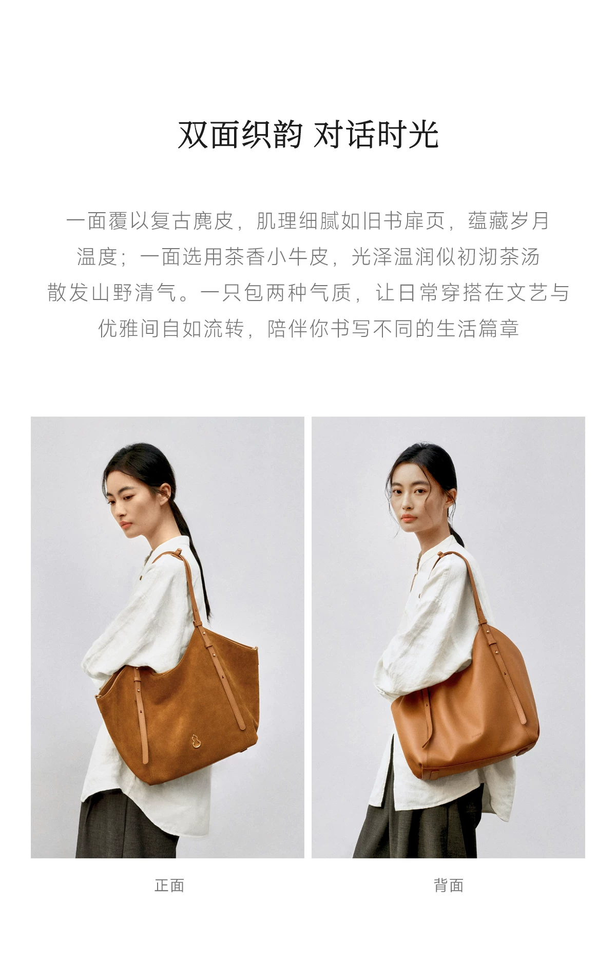 “禾序”托特包最打动人的,是其“双面人生”的创意。一面采用定制丝光绒麂皮,指尖抚过如触云朵,自带温润哑光的复古滤镜;另一面则选用品牌原创的茶香小牛皮,泛着如初沏茶汤般的柔和光泽。一包在手,即可在麂皮的文艺复古与小牛皮的知性温润间自由切换,无需更换包袋,便能轻松匹配从商务会议到周末看展的多重场景,实现“跨风格穿搭”。