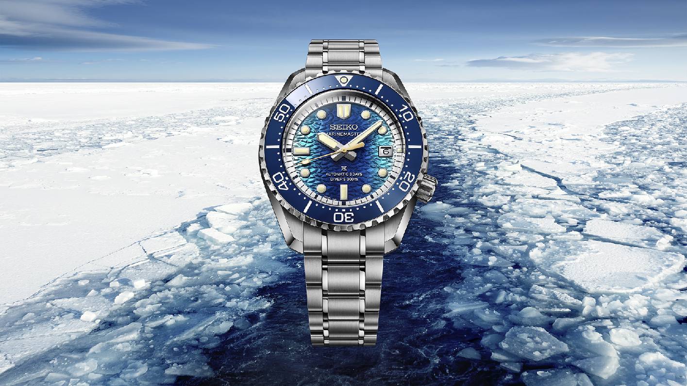 本次发布的两款Marinemaster新作中,HBF002为SEIKO(精工)与日本海洋研究开发机构(JAMSTEC)的联名限量款,全球限量1000枚。表盘采用纵向渐变蓝色设计,灵感源自极地破冰船在海冰中开辟的航迹,象征北极科考大胆探索的精神。另一款黑色表盘版本(HBF001)则承袭1968年经典潜水表的设计语言,深邃黑色表盘搭配细腻粒面纹理,可有效减少光线反射;时标切面边缘可从多角度捕捉光线,进一步提升腕表的易读性。