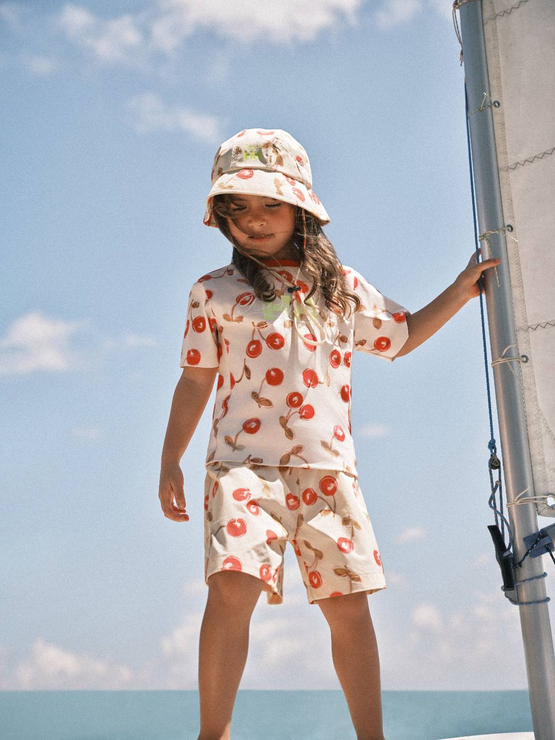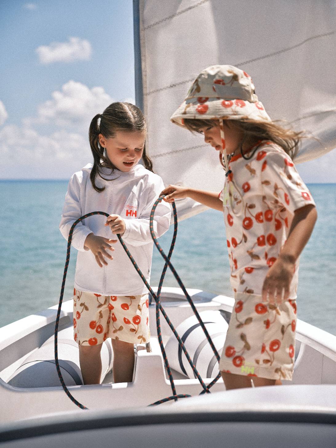 在设计语言上,Bonpoint × HELLY HANSEN 限定联名童装系列以双方标志性 Logo 的视觉碰撞,开启航海精神与巴黎左岸美学的对话。图案设计汲取 HELLY HANSEN 经典的帆船绳索为灵感元素,在户外基因与法式童真之间,建立起独特而平衡的视觉语言。印花则采用层次化工艺呈现,传递品牌精神的同时,亦温柔呵护儿童娇嫩肌肤。联名男童系列以蔚蓝色调勾勒清新海岸氛围,女童系列则在细节中点缀 Bonpoint 标志性樱桃图案,为利落廓形注入灵动童趣。