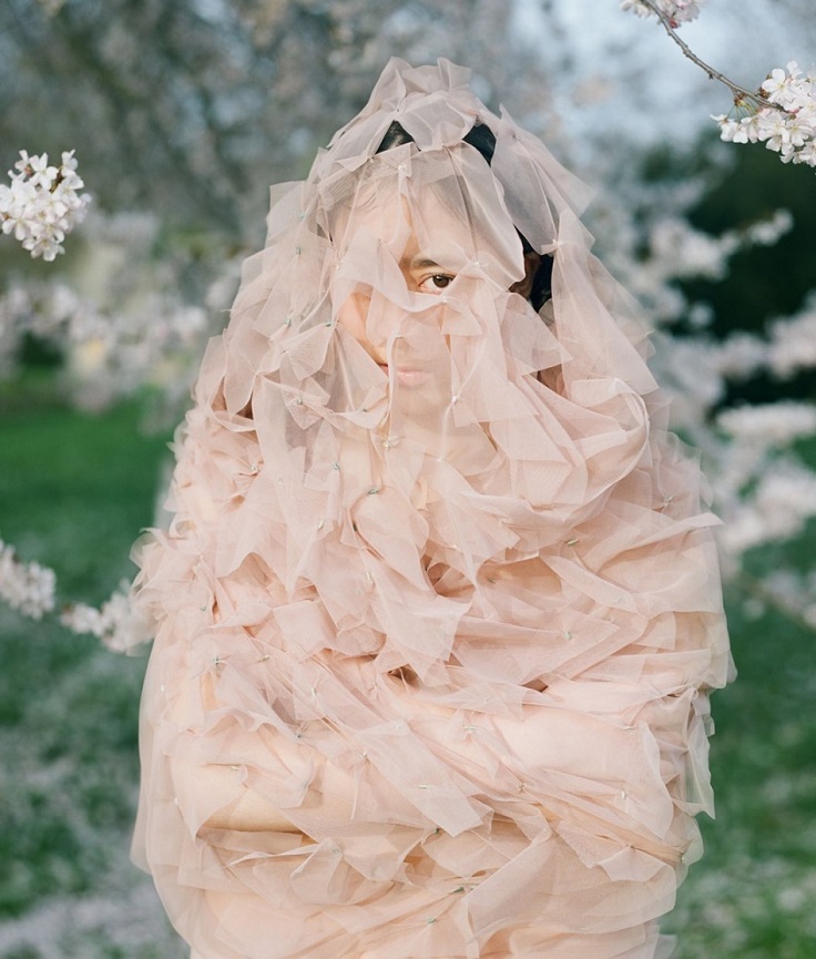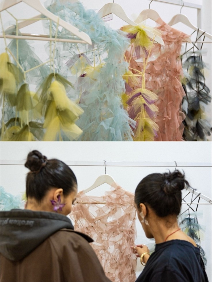 纱,成为她近年来反复探索的材料。这种常被视作轻盈甚至仅作装饰的面料,在 studio.j.z 手中经历叠加、缝合与固定,却依然保持灵动的张力。作品不强调贴合,也不追求包裹感,而是在肌肤之外构筑出一层可被感知的空间。正是在这种微妙的处理下,纱不再只是轻盈的表象,而是成为承载结构感与节奏感的媒介,让观者在触觉与视觉之间同时感受到设计的精密与温度。