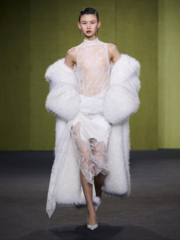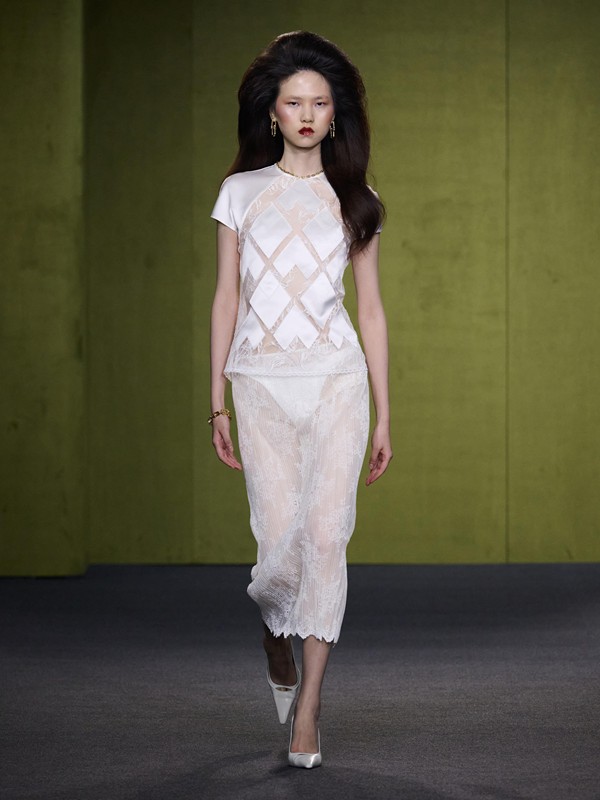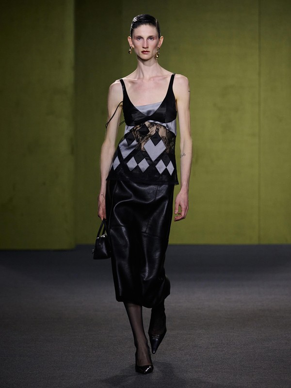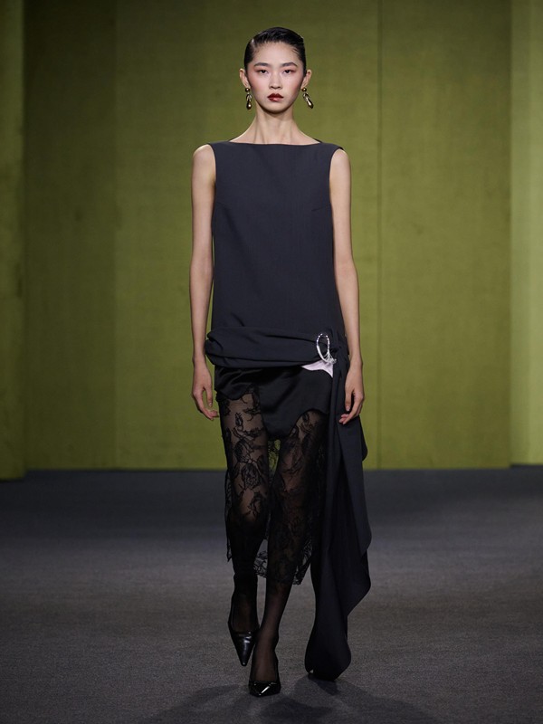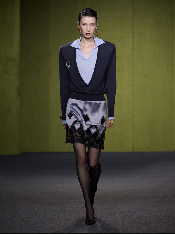 面料成为叙事的另一重语言。蕾丝的朦胧、缎面菱形格的精致光泽、纯羊毛提花的温润、皮革的冷冽,在秋冬衣橱中构筑丰富的质感层次。外套之上,手工串珠如思绪般点缀其间,立体而生动。不规则拼接将柔质面料解构重组,于无序中见秩序;同面料成套设计则强调整体感,在日常穿着中实现辨识度与完成度的平衡。