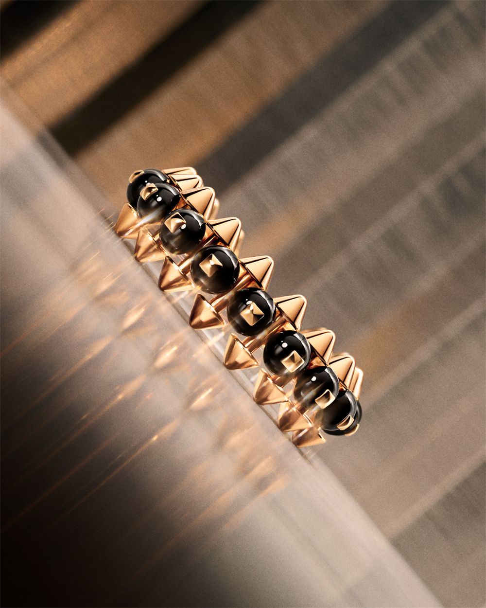 红色玛瑙或绿色玛瑙、粉色玉髓与缟玛瑙的缤纷色彩,令Clash de Cartier系列呈现丰富美感。精致圆珠与玫瑰金铆钉交错排列,凸显系列戒指、项链与耳环作品富有建筑感的立体造型。