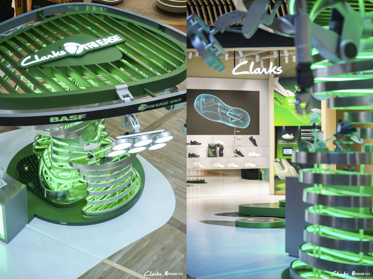 空间的视觉叙事,始于外场的一座“能量脉络”未来感装置。它跳脱了传统静态陈列的框架,以机械臂与能量等高线,构建了一个持续“生长”的、充满未来诗意的有机体。其灵感内核植根于“一生二,二生三,三生万物”的东方哲思,凝练地诠释了Clarks与巴斯夫联合研发的核心理念:一为品牌对“行走”本质的深究与实验,二为诞生于理念下的TRIEASE轻松走鞋履,三则是支撑这次“行走再进化”的三大科技革命。整个装置由两部分构成:一部分源自TRIEASE轻松走的AIGC宣传片,将脚部的压力、能量等生物力学数据,转化为流动的等高线图谱,呈现出充满未来感的“机能美学”;另一部分则是冷静运转的自动化机械臂,精准复现着“立体喷涂”的核心工艺。一动一静之间,宣示着品牌对未来步行方式的构想——更高效、更科学、更可持续。生机绿作为主视觉色彩贯穿始终,渲染出兼具理性与生命力的独特氛围。