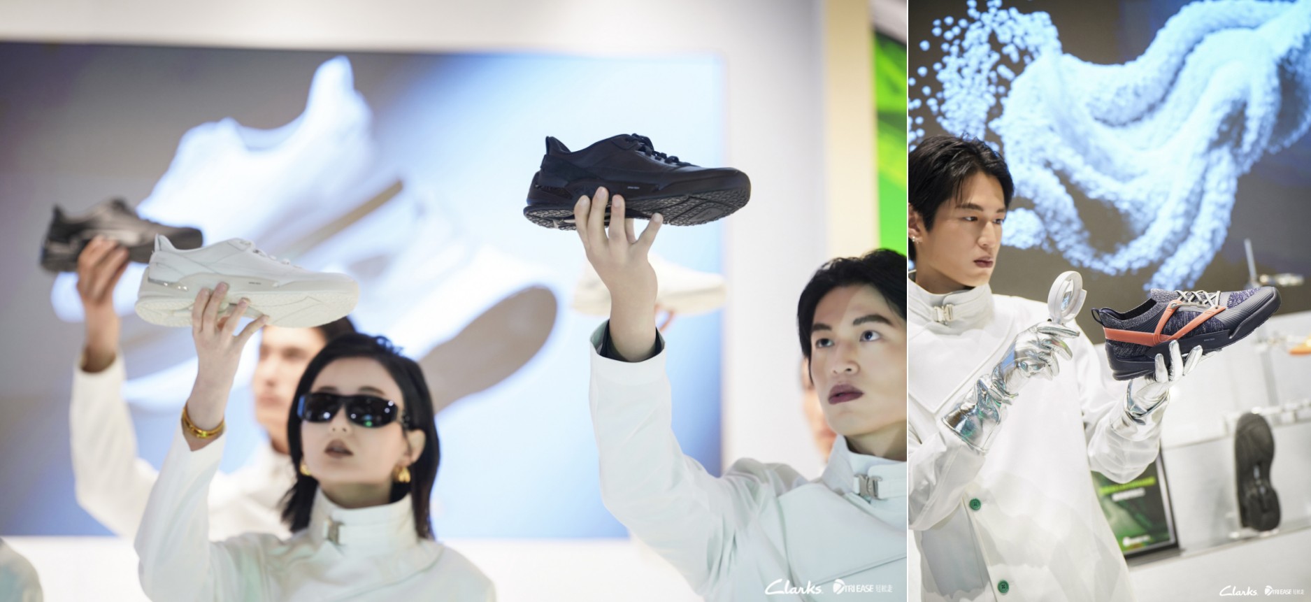 整场发布,被打造为一次极具先锋感的沉浸式创意秀。它超越了传统T台与定点的限制,模特是这场实验的主角——他们身着白大褂,以未来科研人员的姿态散落在空间各处,并将TRIEASE轻松走产品作为核心“实验样本”,以行为艺术的方式呈现。随着实验进程进入高潮,他们同步脱去实验外衣,以充满未来感的造型,释放松弛而自信的时尚能量。TRIEASE轻松走系列在这群“未来行者”脚下,完成了从理性解构到感性释放的完整叙事。秀的终章,两位机器人携新鞋登场,Clarks大中华区总经理Rebecca Chen女士与巴斯夫亚太区鞋履/运动/休闲业务总监吴小军博士一同,将承载着数据与理念的TRIEASE轻松走嵌入核心装置。顷刻间,装置脉络与嘉宾手环同步点亮,象征着舒适科技的进化图谱被正式开启,一场关于行走的未来实验,就此启程。