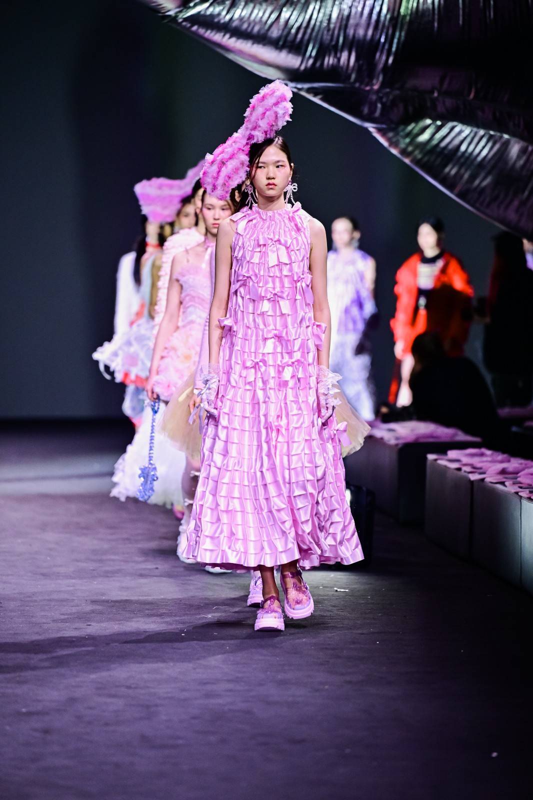 系列以丰富的包裹与蝴蝶结细节为核心,同时借助透明感、花卉几何与色彩解放光的流动,在服装内部营造出发光的幻觉。包裹、蝴蝶结与流动的丝带肩带构建出刻意的矛盾:克制与释放共存,柔软与叛逆并肩。造型携带着勇士的力量与反叛精神:征服自己的灵魂,花朵将在无限中再度盛开。