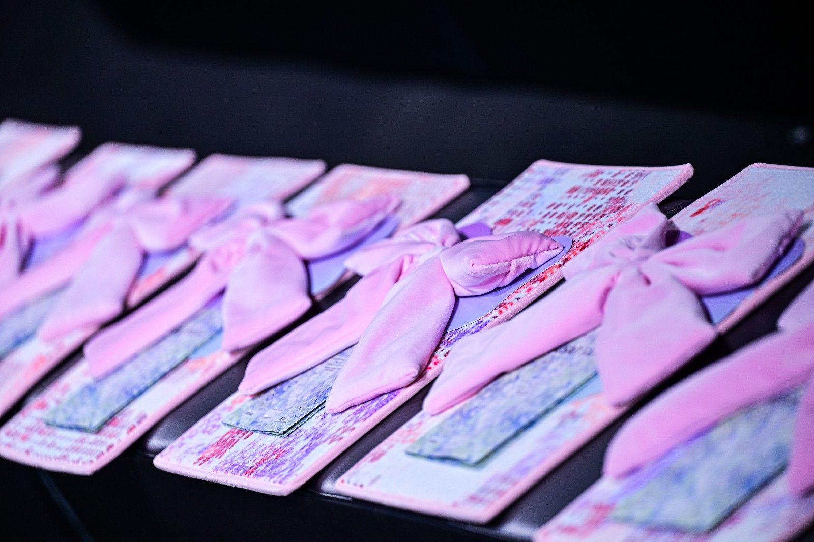 【粉晶鎏光】—— 蝴蝶结在温暖的粉色调中逐渐叠加、交错,粉晶般的光泽营造出丰富的层次与空间感,在柔和的映像中延展。