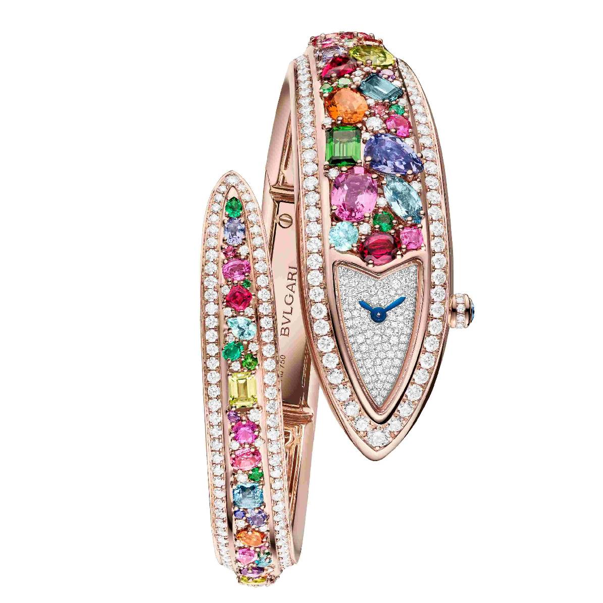 耀目宝石:493颗圆形明亮式切割钻石(重约5.0克拉);122颗圆形切割、梨形切割、方形切割及椭圆形切割彩色宝石,包括红碧玺、紫水晶、托帕石、祖母绿、黄水晶、粉色蓝宝石、坦桑石、帕拉伊巴碧玺、沙弗莱石、锰铝榴石、粉红碧玺、海蓝宝石、蓝色蓝宝石以及橄榄石(重约13克拉);1颗圆形明亮式切割蓝色蓝宝石(重约0.2克拉)。