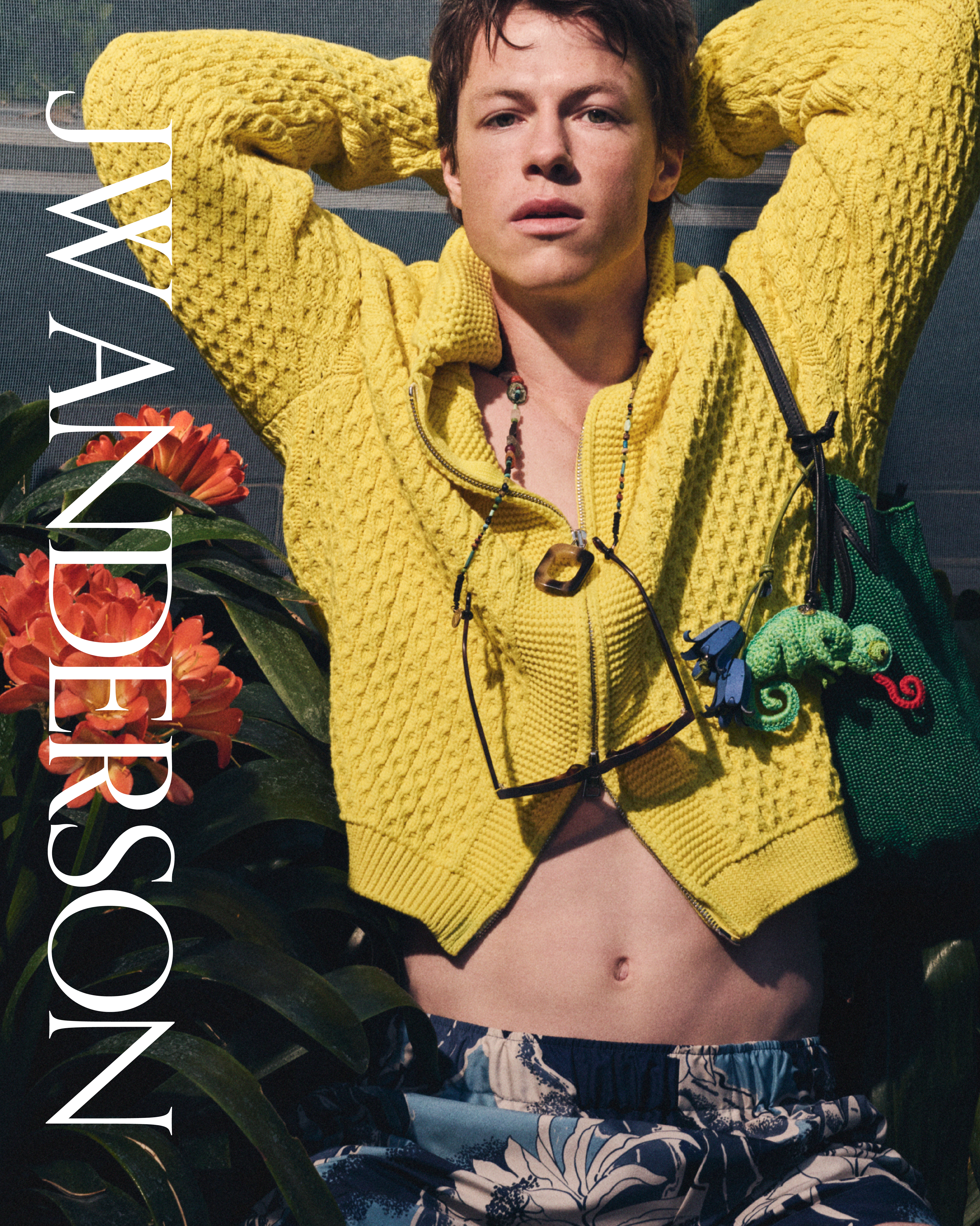 标志性印花图案贯穿男士开领衬衫与短裤套装,以及女士露肩连衣裙等核心单品。图案灵感源自对Dale Hope工作室的一次探访——他以收藏与保护夏威夷衬衫及印花作品而闻名。JW ANDERSON 从其档案中甄选出一款名为“Panini o ka Punahou”的手绘花卉图案,描绘一种夜间绽放的仙人掌花:多见于夏季,于黄昏时分绽放,白色花瓣环绕黄色花心徐徐展开,并于拂晓时分凋谢。夏日意象跃然图案之上——热烈而短暂。
