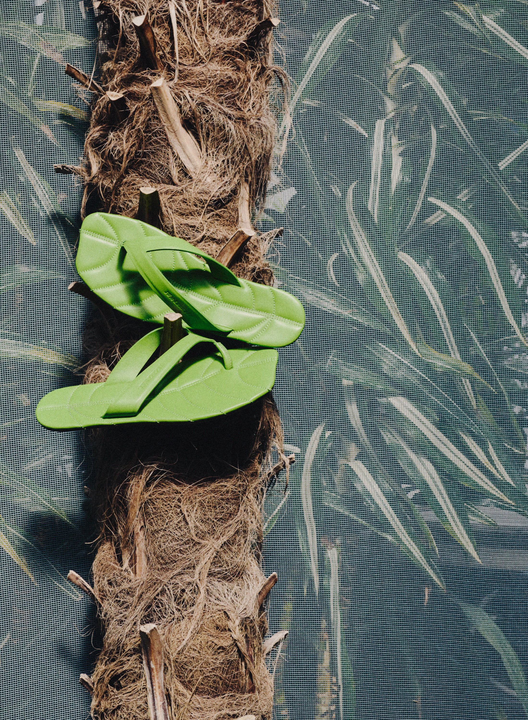 对工艺的坚持延续至鞋履与配饰系列,在成衣基础上延续明亮色调、编织细节与开放通透的廓形表达。核心单品包括树叶造型拖鞋,以皮革打造,饰以生动的叶脉纹理细节,与编织平底鞋及撞色高跟鞋共同呈现。