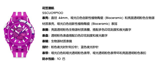腕表的不透明部分采用创新性植物陶瓷 (Bioceramic) 打造,增添一抹亮丽白色点缀,而透明彩色部分则采用取自蓖麻油的生物源材质,展现宛如水母触须般轻盈通透的效果,进一步烘托了以海洋为灵感的设计风格。