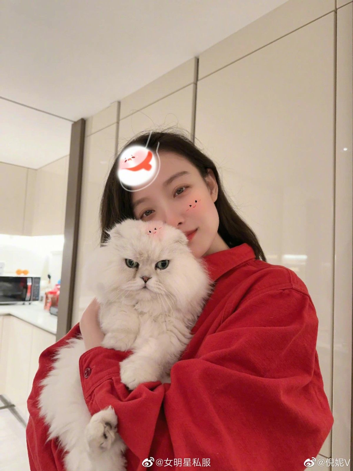 倪妮一身简约红衬衫,抱着猫咪,可可爱爱。