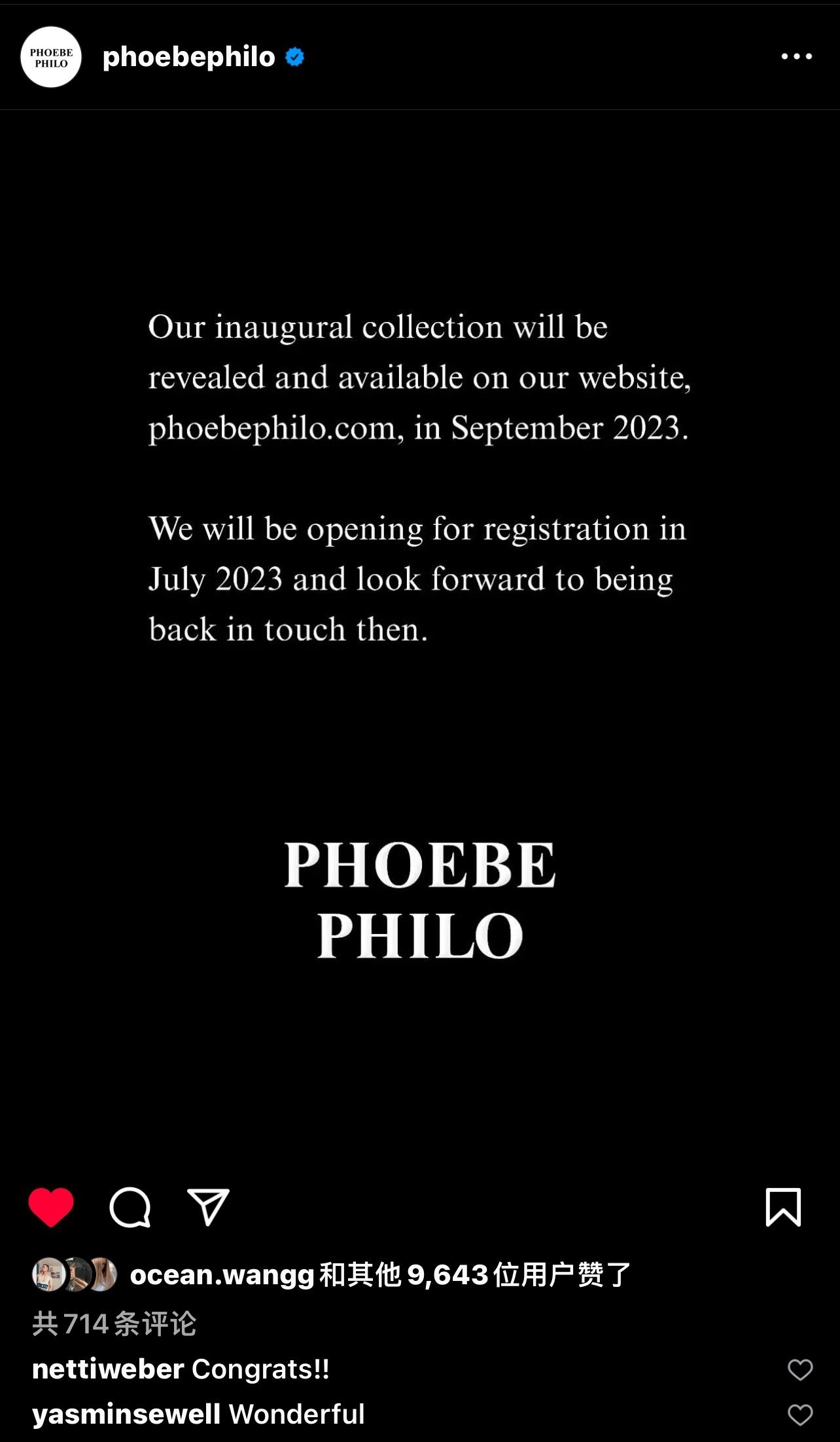 本周,Phoebe Philo在官方Ins账号宣布她的个人同名品牌首个系列将于今年9月份发布!不知这一举动是否将对BV、Jil Sander等如今稳坐极简风交椅的品牌产生极大冲击呢?