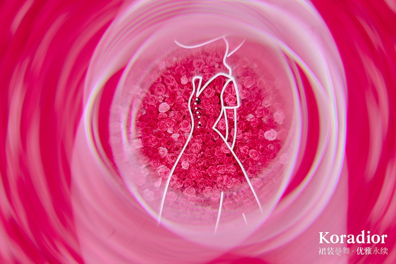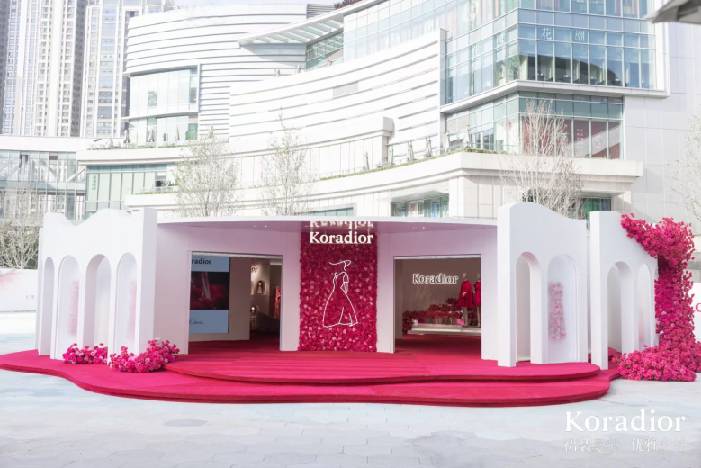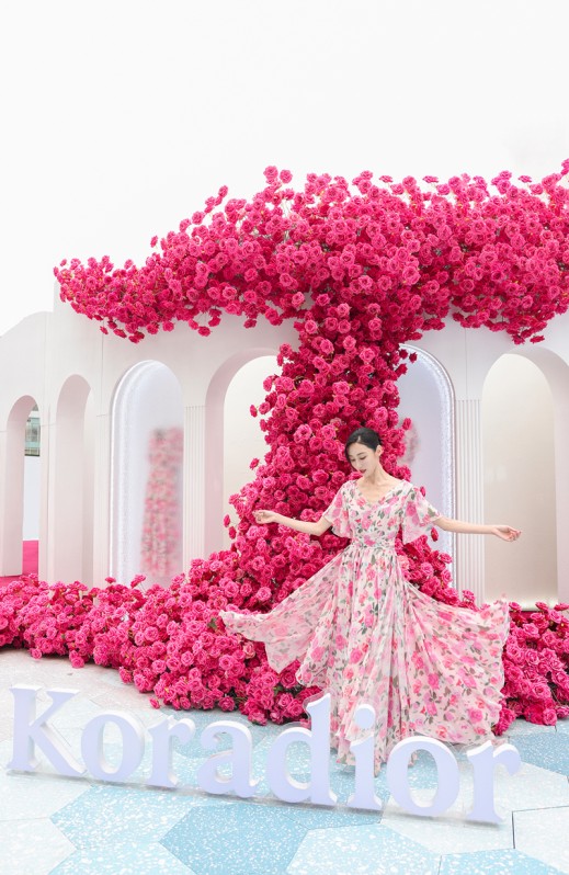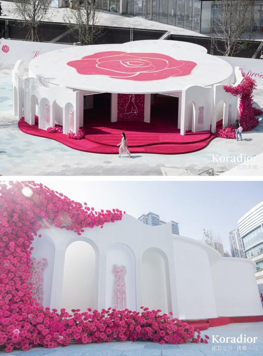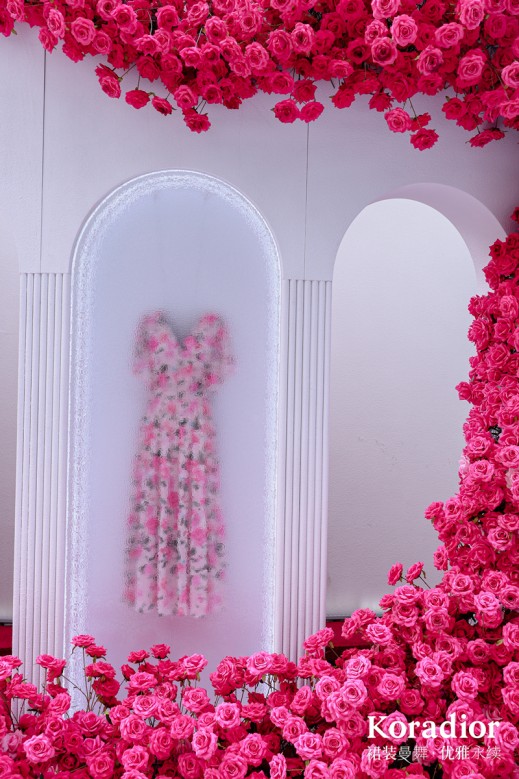 Koradior珂莱蒂尔·裙装季,「裙装曼舞 优雅永续」主题限时店整体空间设计灵感来源品牌标识「玫瑰」,顶部以品牌巨型「线稿玫瑰」为造型,底部蔓延的玫瑰花边以不对称的手法,营造流动的美感。时尚吸睛的品牌玫瑰红,渲染出梦幻般的玫瑰绮景,绽放浪漫魅力。