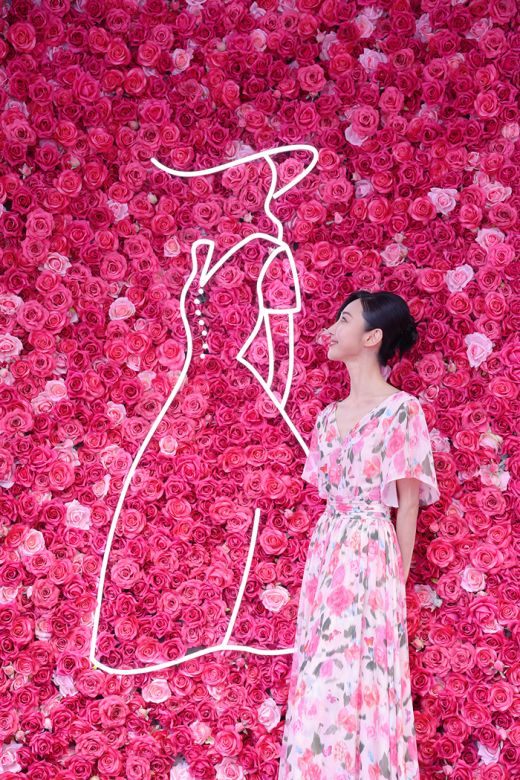 品牌经典连衣裙K dress以独特艺术形态嵌入玫瑰花墙之中,曼妙的裙身曲线与专属的品牌印花透过玻璃若隐若现,给人一种不可触及的美感。