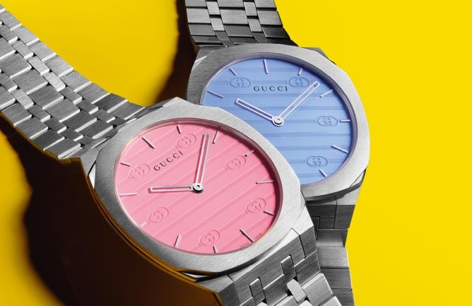 说到Gucci的代表性元素,“互扣式双G”可以称作经典标识了。Gucci 25H系列腕表将其应用于表盘设计中,融合流线型表身,展现都市美学和建筑风格。