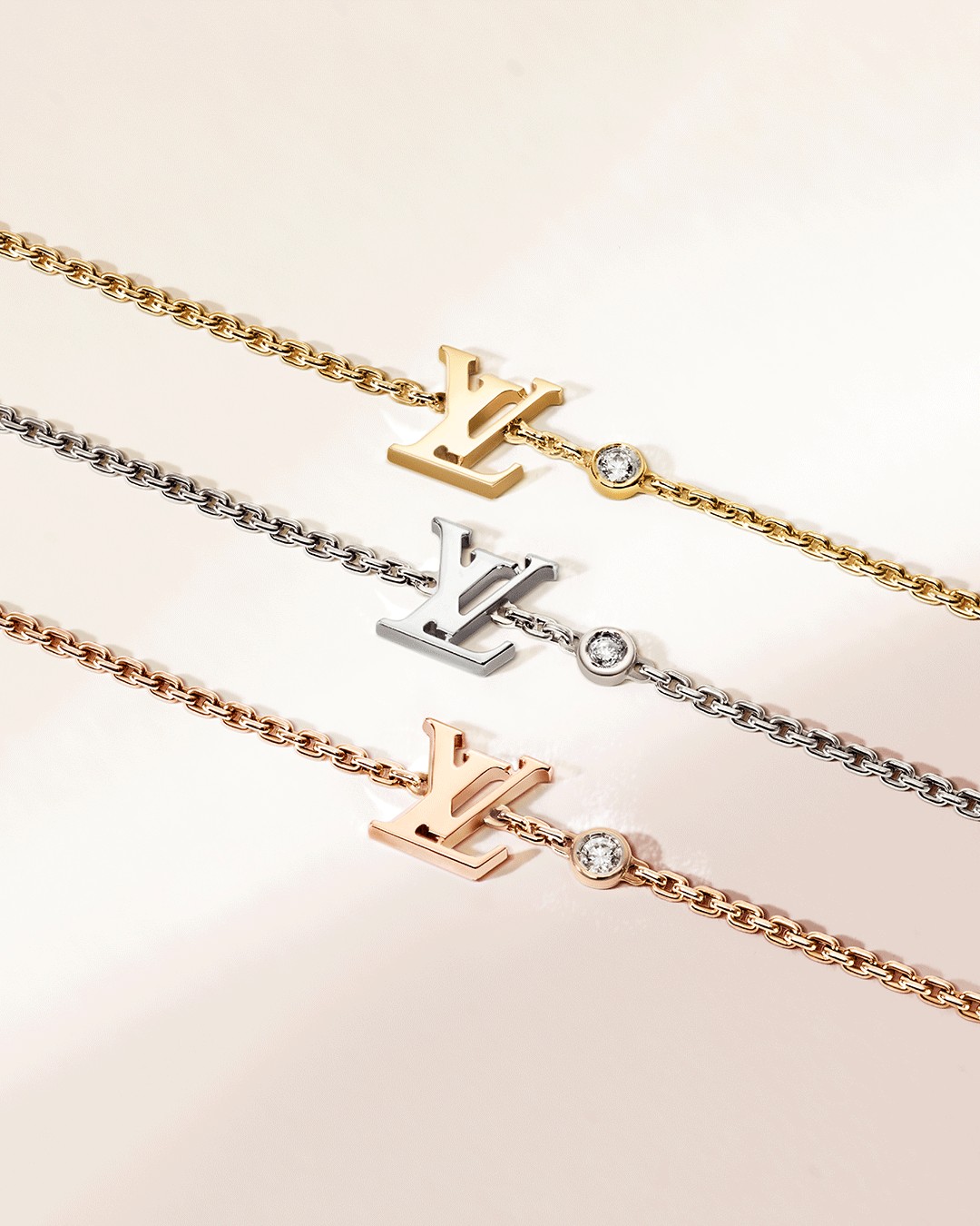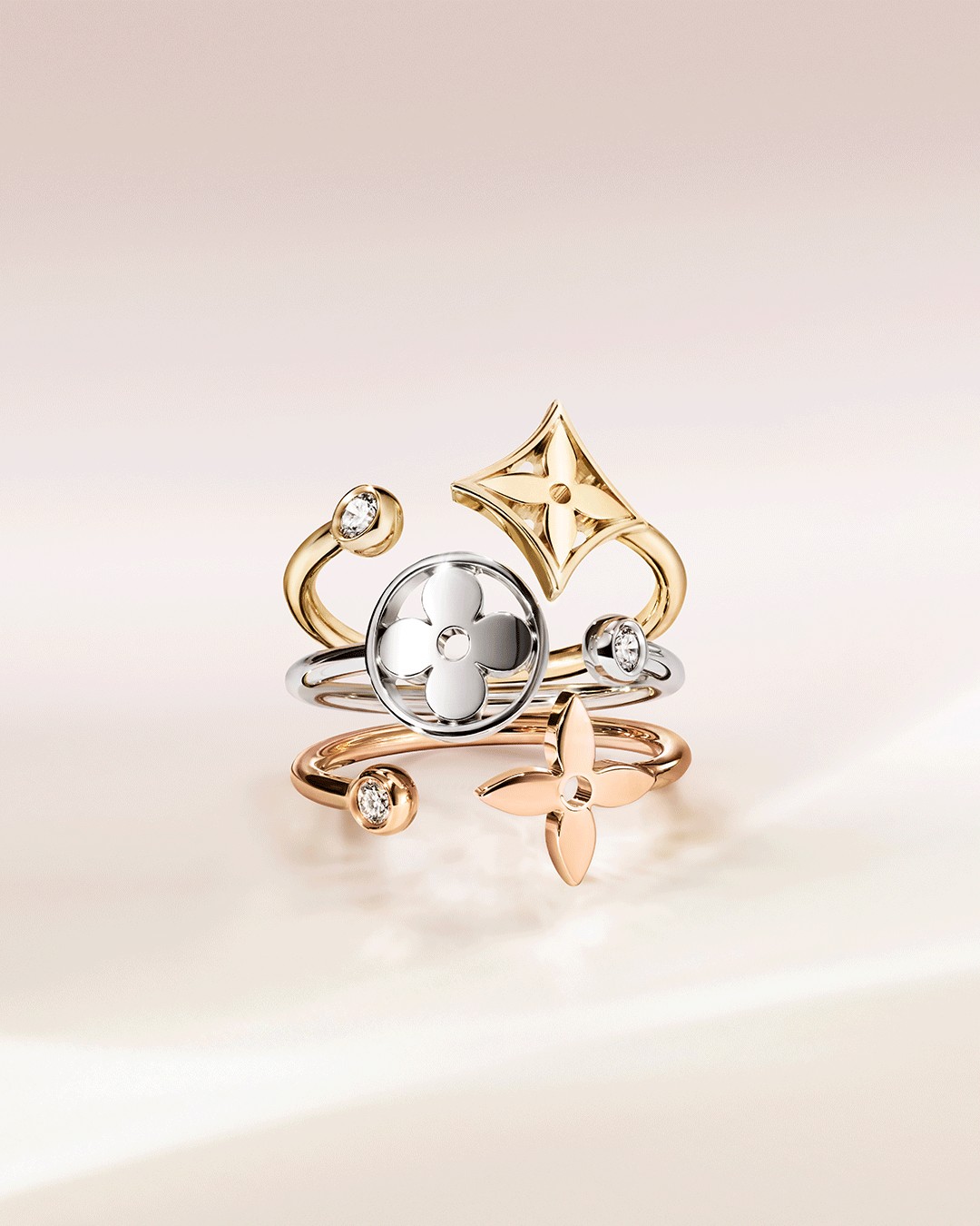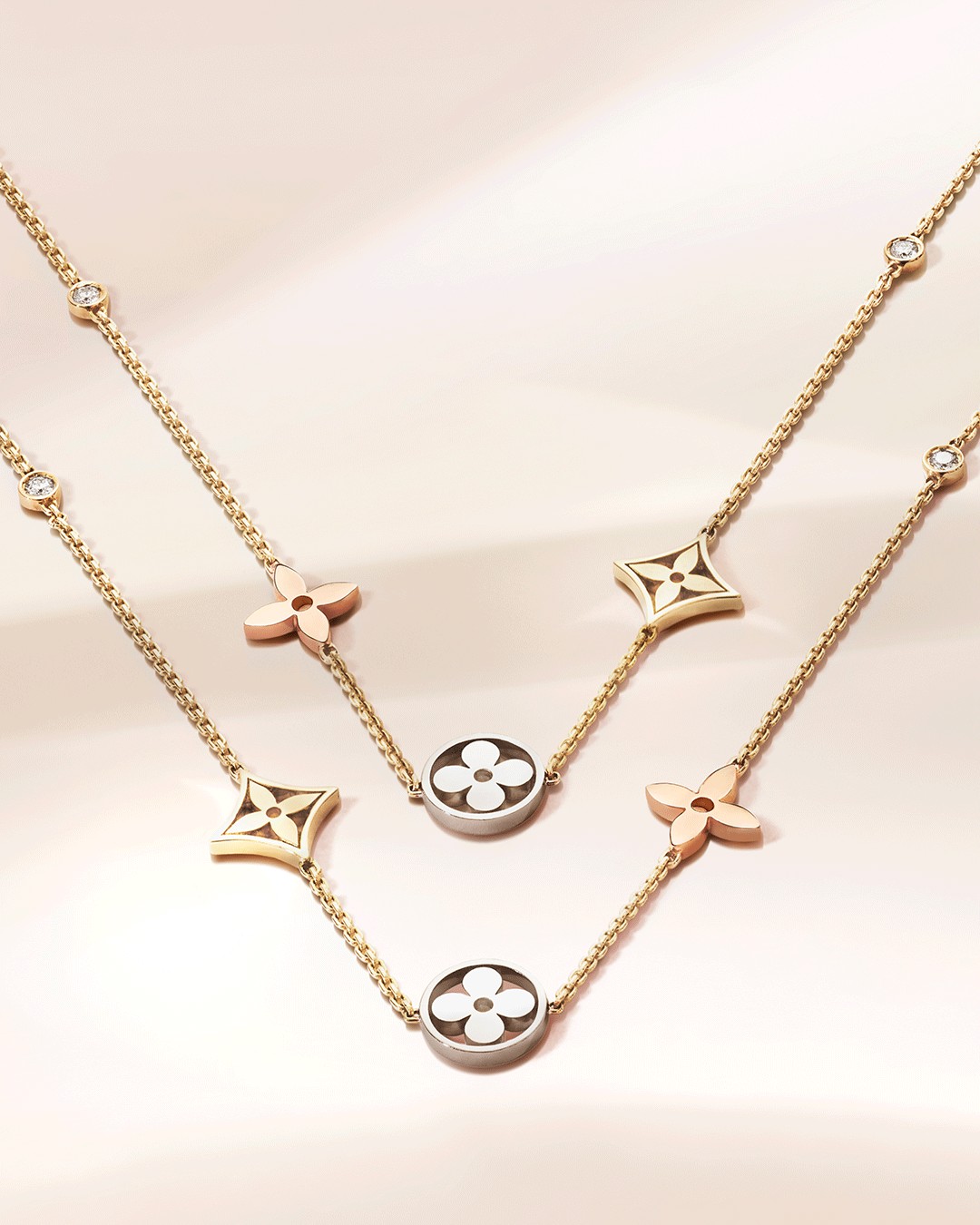 路易威登Idylle Blossom珠宝系列作品色调与造型和谐相融,鼓励配搭者探索个人风格,流露出现代女性的内在之美:摩登、闪耀和自由。